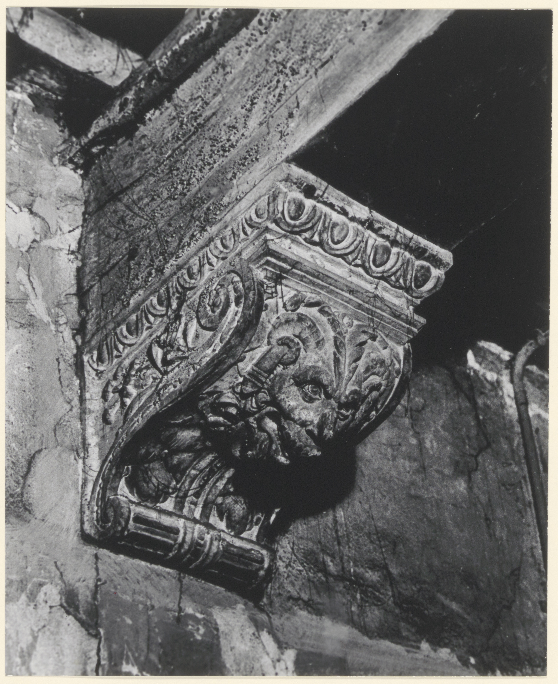 Een balkconsole met kop in het huis Swartsenborg in de Wijnstraat.
