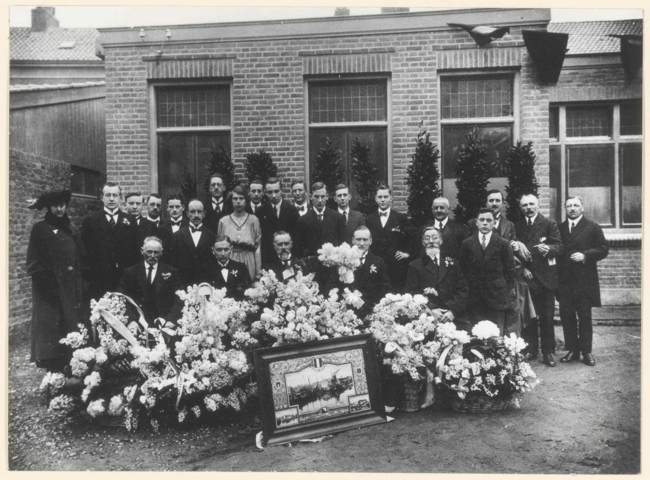 - Groepsfoto van directie en kantoorpersoneel van de Kalkfabriek Van Dijk & Co. aan de Lijnbaan bij het 25-jarig bestaan omstreeks 27 maart 1922; op de voorgrond tussen bloemen een ingelijste foto van het bedrijf.