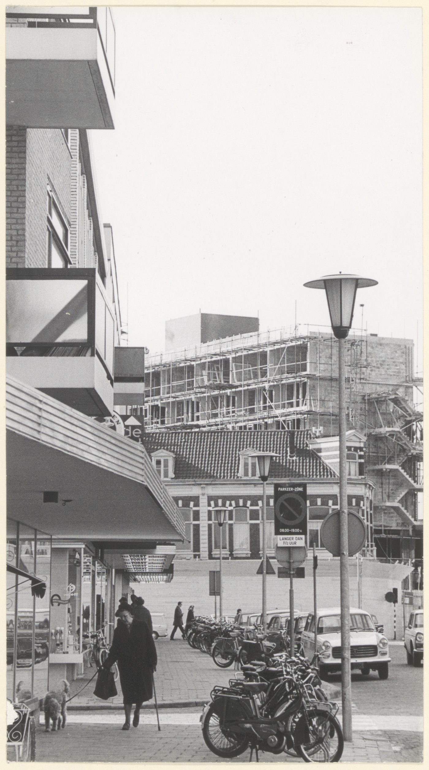 auto's bouwwerkzaamheden bromfietsen / brommers fietsenrekken / fietsenstallingen flatgebouwen honden lantaarns / straatverlichting schoenwinkels / schoenmakerijen voetgangers