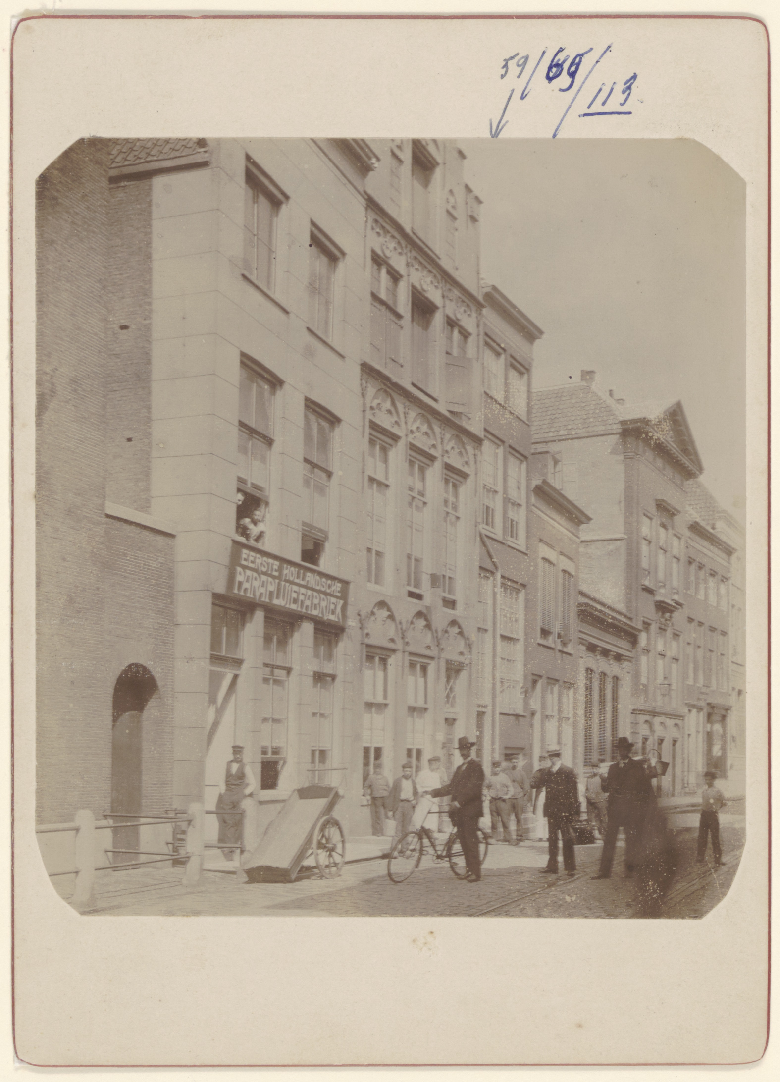 - De Wijnstraat met centraal het nummer 113; links daarvan de Eerste Hollandsche Parapluiefabriek.