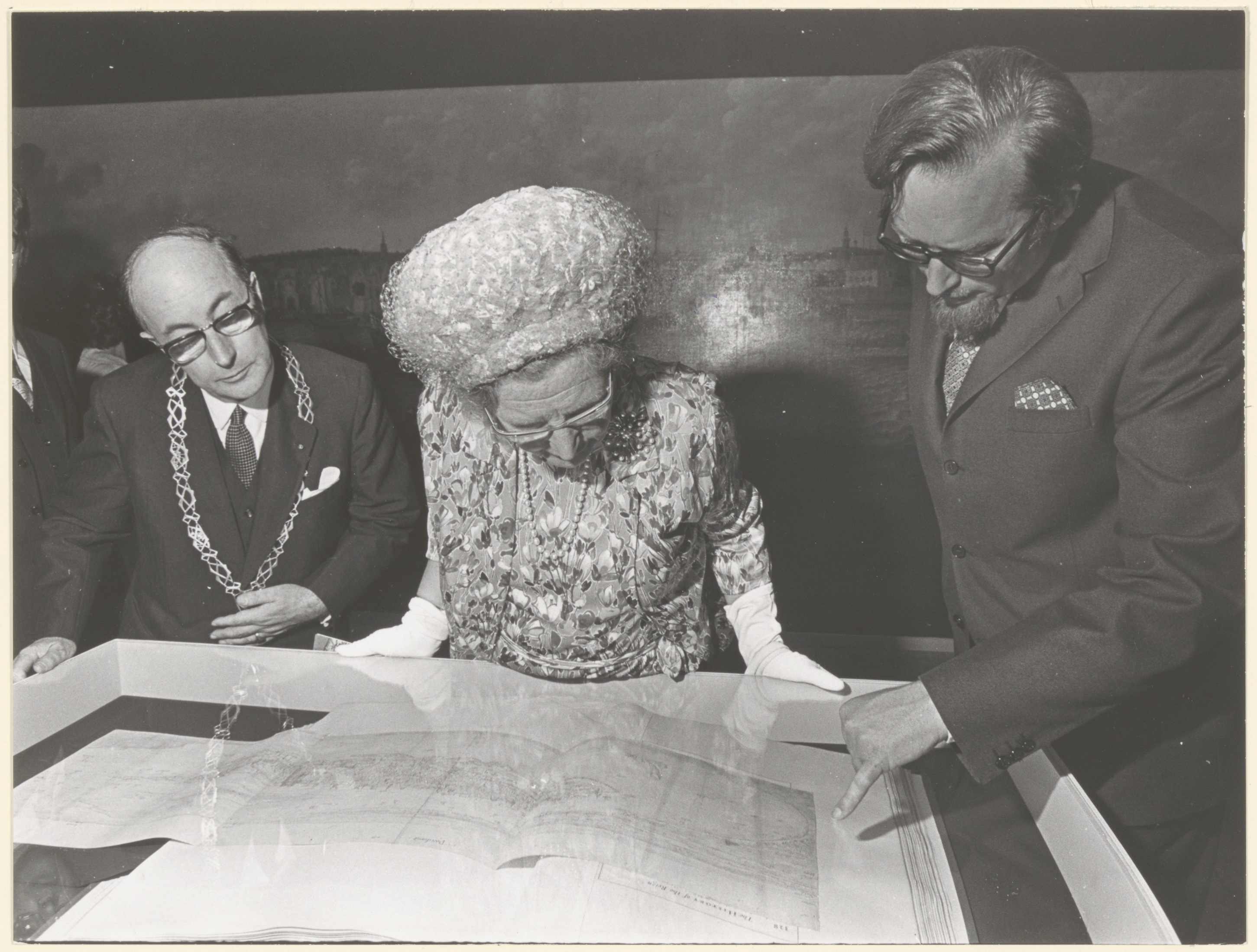 Koningin Juliana bezoekt de tentoonstelling Opstand en Onafhankelijkheid in de Augustijnenkerk in gezelschap van burgemeester Van der Lee en archivaris Jensma ter gelegenheid van de herdenking van de eerste vrije Statenvergadering in 1572.