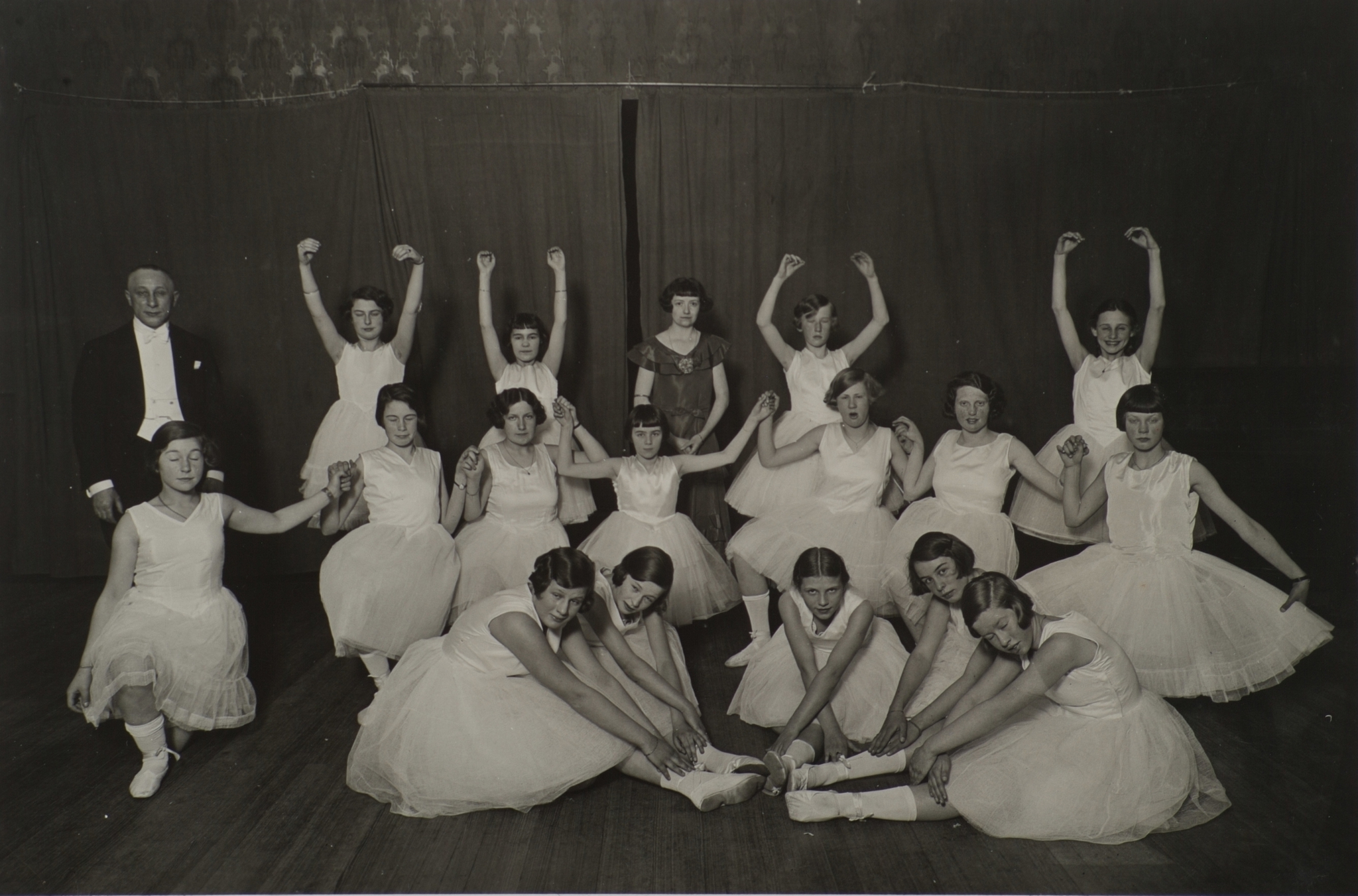 - Balletuitvoering in de bovenzaal van Hotel Ponsen door dansschool Meier & Fils. V.l.n.r. staand: Dansleraar Meier, Truus van der Koogh (geboren ca. 1917), onbekend, lerares (Engelse, naam onbekend), Ted de Jong (Dubbeldam 1918), Marietje (Iek) Vriesendorp (ca. 1918). Knielend: Janny v.d. Kloet (1919), Adrie Jas, onbekend, onbekend, Margot Delhez (ca. 1917), onbekend, onbekend. Zittend: Alice Stumpel?, Mimy de Kiewit (1919), Greetje ...?, Thea Reimers (ca. 1918), Jet van Gijn (ca. 1918).
