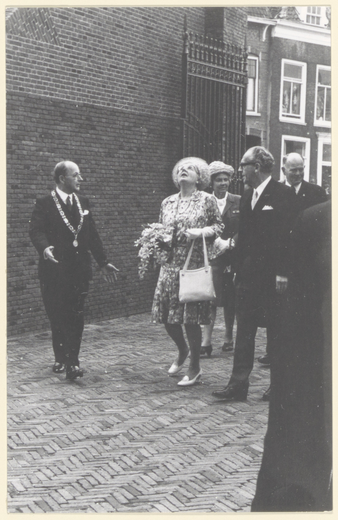 Koningin Juliana en burgemeester Van der Lee op weg naar de toreningang van de Grote Kerk tijdens het koninklijk bezoek ter gelegenheid van de herdenking van de eerste vrije Statenvergadering in 1572. Op de achtergrond de Korte Geldersekade.