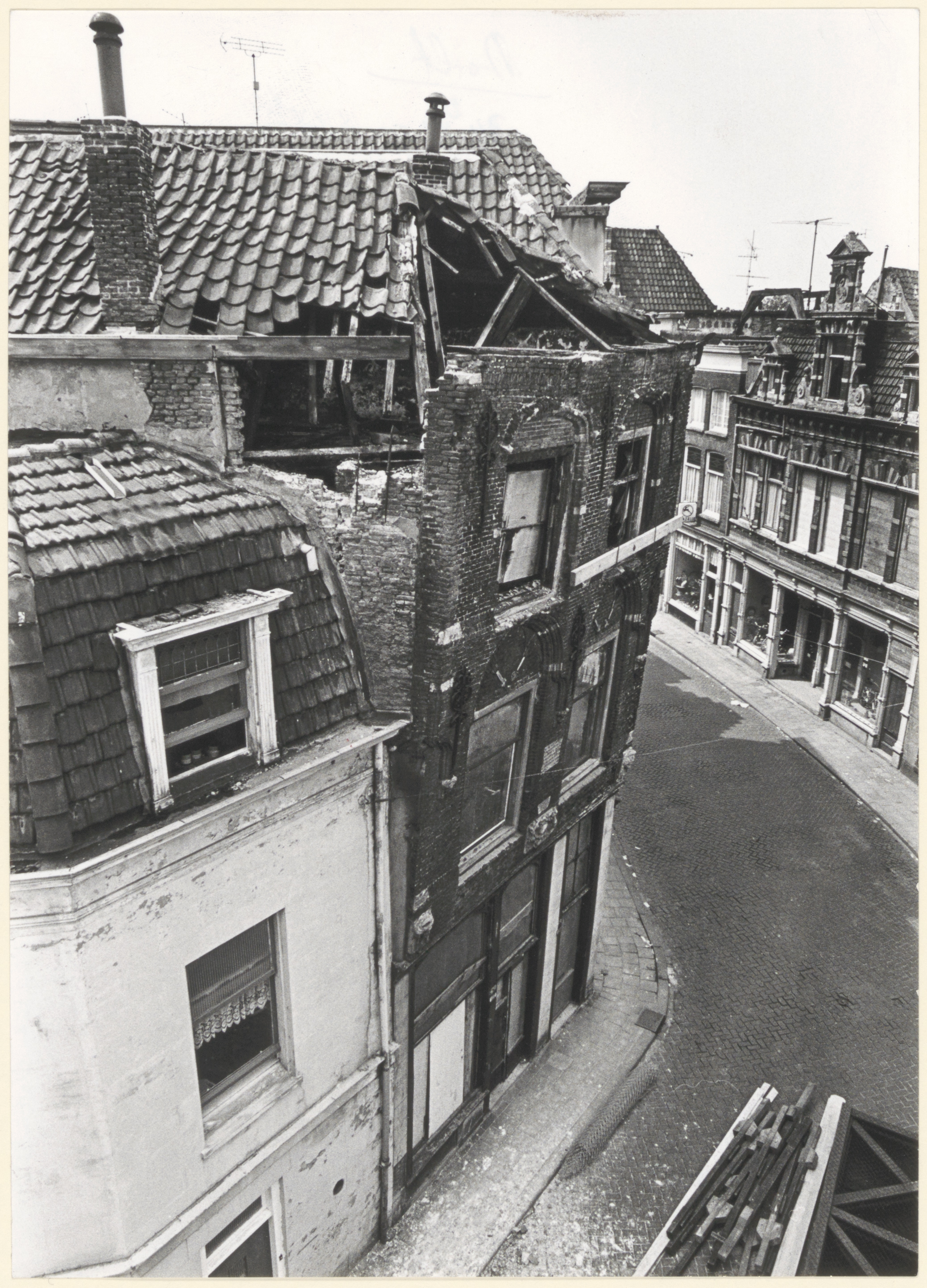 - Op instorten staande panden Riedijk 122 - 124. Rechts het begin van de Voorstraat naast het Melkpoortje.