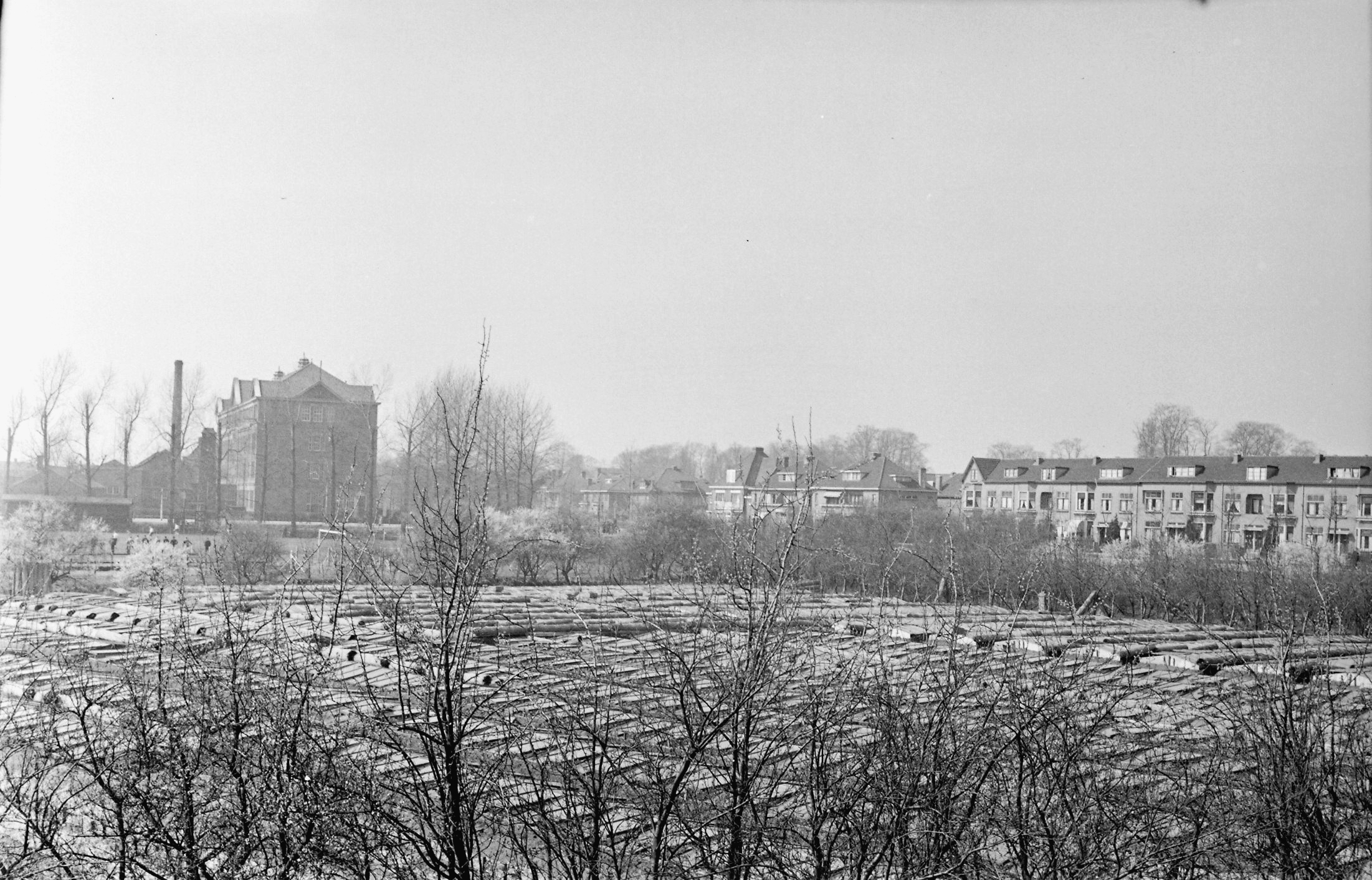 - De M.T.S. aan de Oranjelaan, gezien vanaf de Noordendijk. Tussen het bouwland op de voorgrond en de school, ligt het voetbalveld van D.B.v.L.O., dat op de hoek van de Bankastraat en de Oranjelaan ligt.