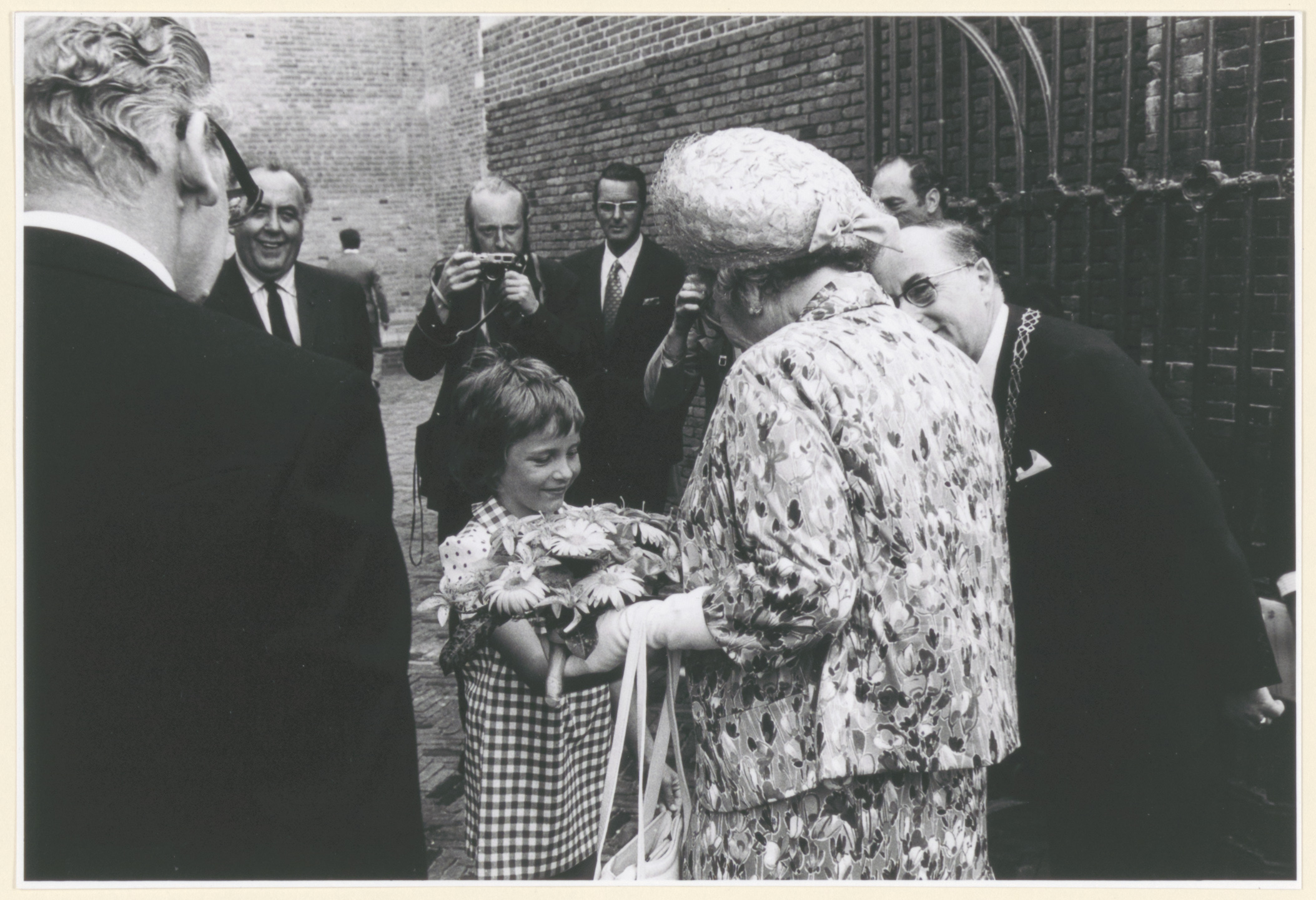 - Koningin Juliana, in gezelschap van burgemeester Van der Lee (rechts), bezoekt de Grote Kerk ter gelegenheid van de herdenking van de Eerste Vrije Statenvergadering van 1572.