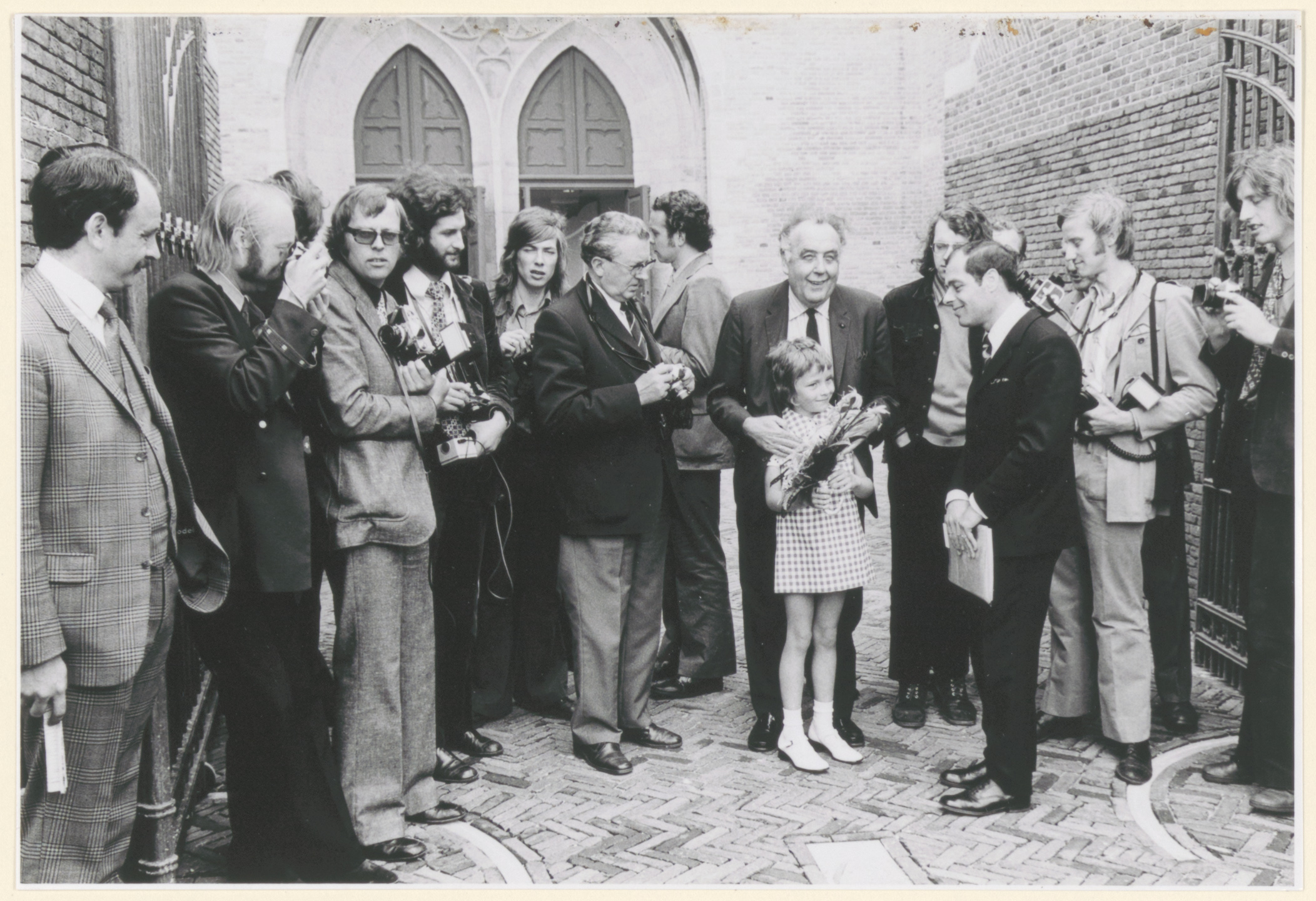 Ontvangstcomité en persfotografen bij de toren van de Grote Kerk in afwachting van de …