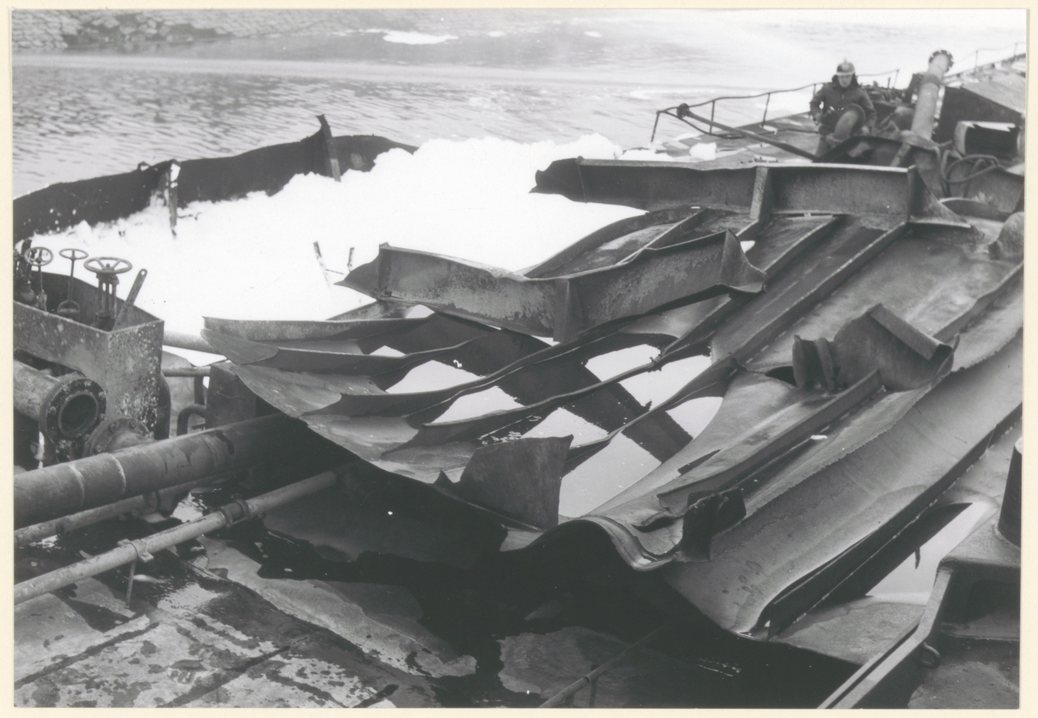 - Brandweerlieden inspecteren het nog met blusschuim gevulde wrak van het tankschip Manuella in de Julianahaven na de explosie en brand van 27 december 1972.