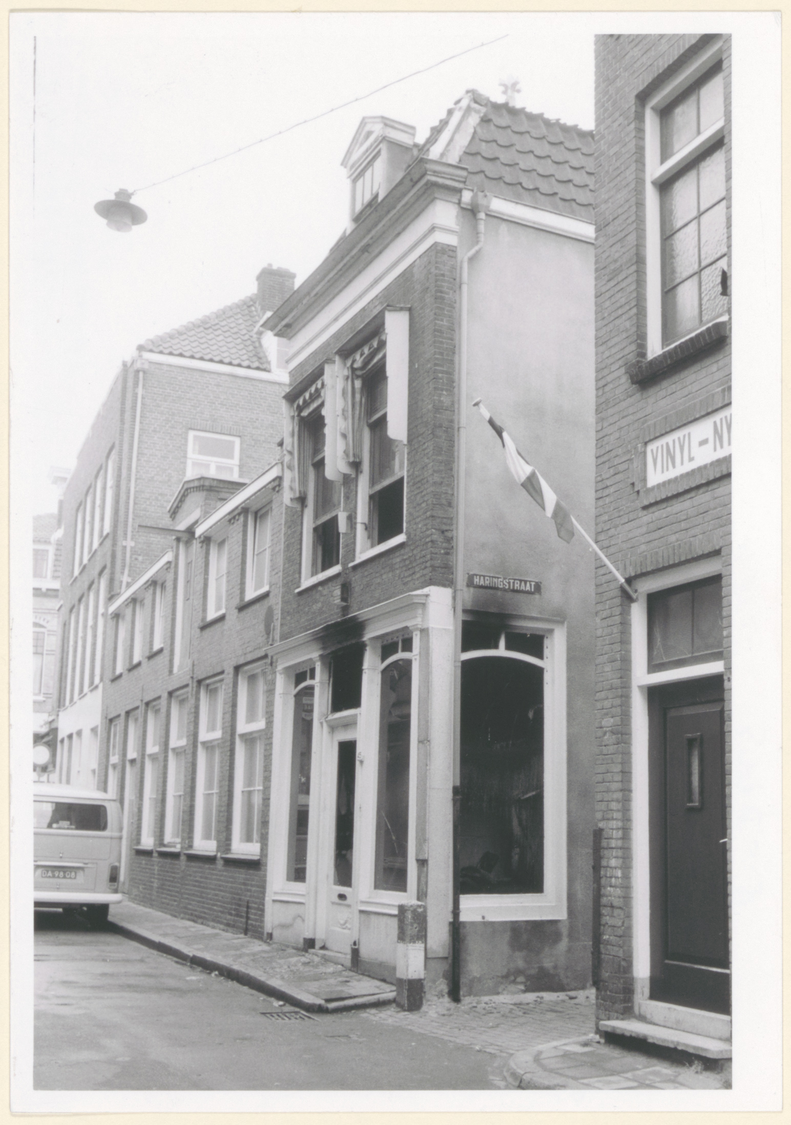 - Het op 15 oktober 1972 uitgebrande pand van schoenwinkel P. Lagarde in de Lange Breestraat op de hoek van de Haringstraat, gezien naar de Grote Spuistraat.