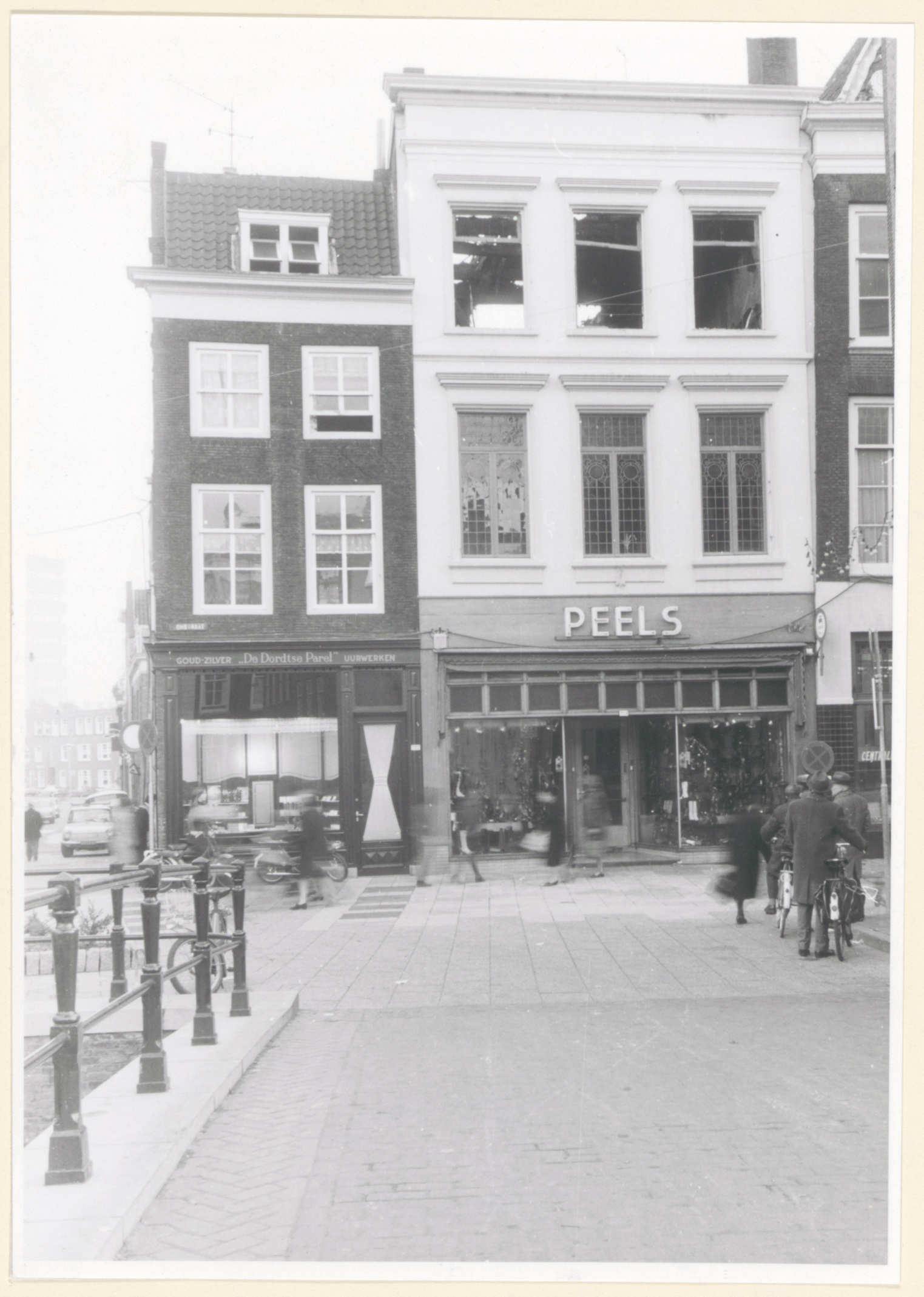 Het pand Voorstraat 324 waar schoenenhandel Peels was gevestigd; deze opname is na de brand van 14 december 1971, gezien vanaf de Lombardbrug; links de Lombardstraat.