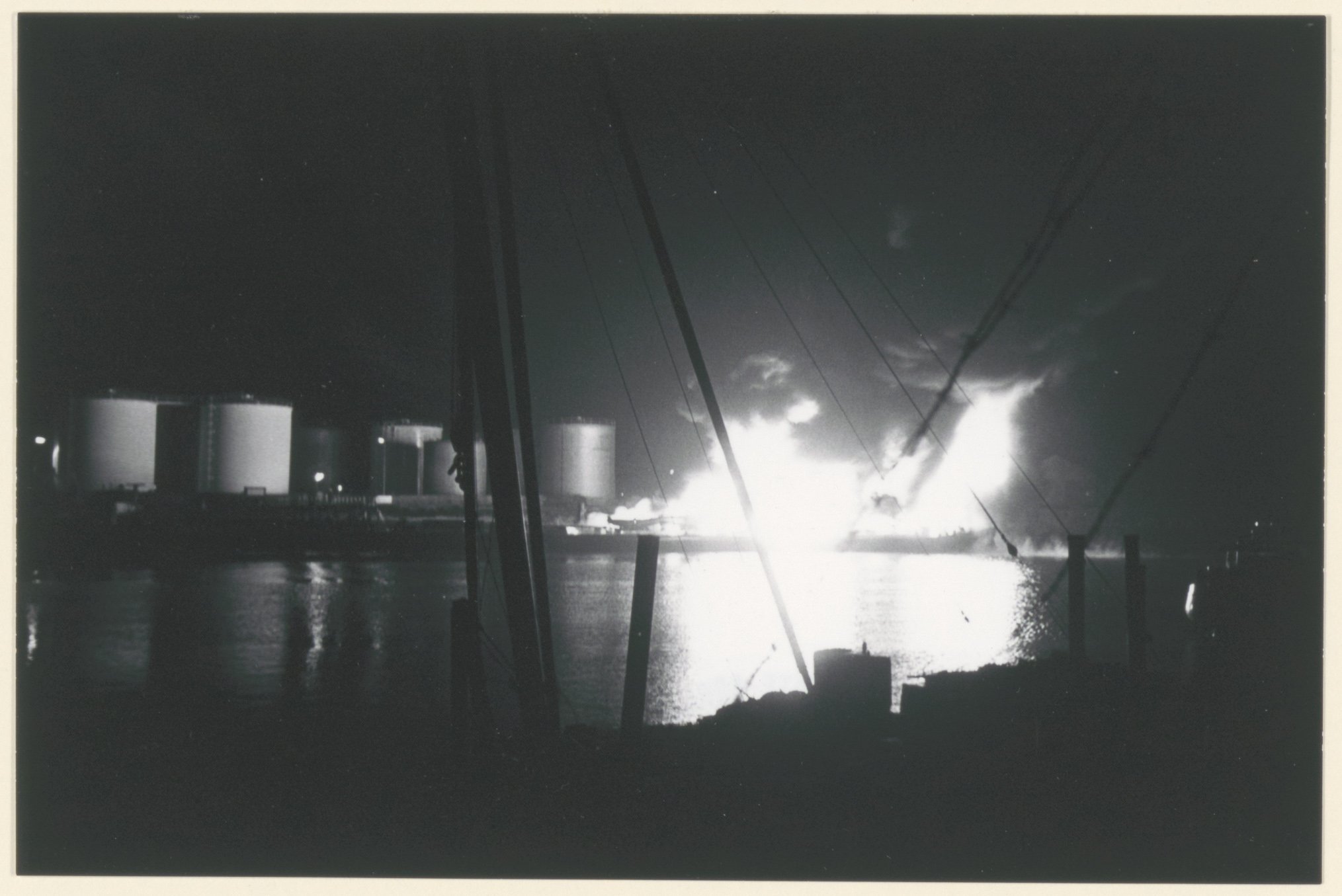Het brandende tankschip Manuella in de Julianahaven na een explosie.
