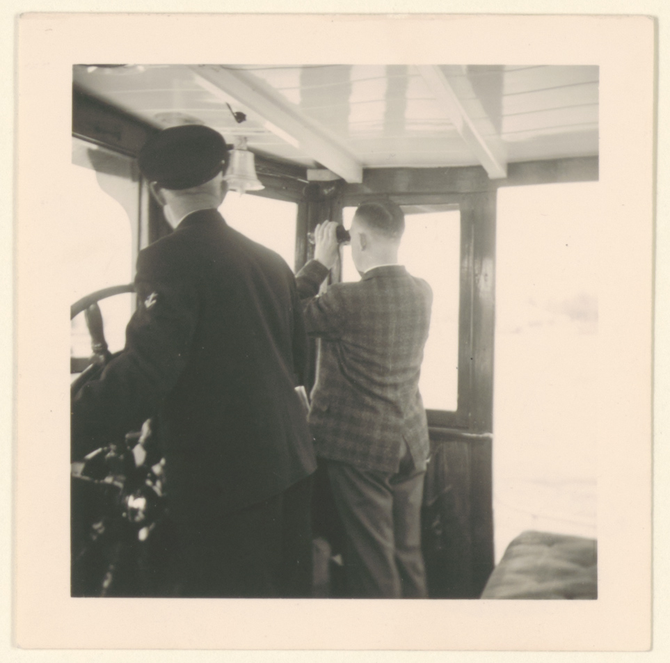 - Ziekenbroeder Henk Boogaard van de G.G. & G.D. kijkt ver door een verrekijker tijdens een boottochtje van het personeel; naast hem de roerganger.