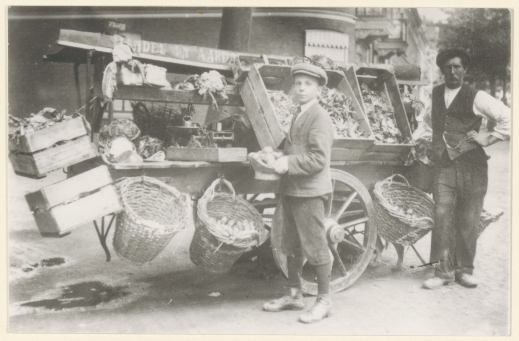- Groenteman P.W. van Holten met hulpje en een hondenkar op de Albert Cuypsingel bij de hoek van de Beverwijckstraat.