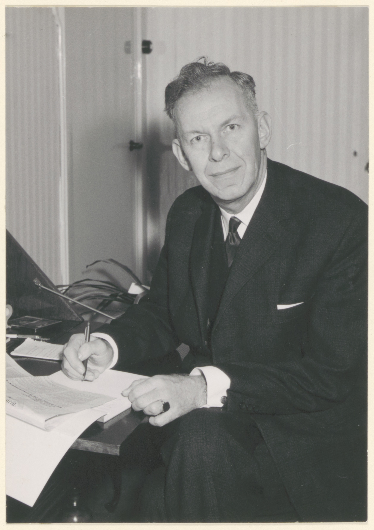 - A.L. van der Smit, zittend aan een secretaire met pen in de rechterhand, geboren in 1913, overleden te Dordrecht in 1966, Nederlands hervormd predikant te Dordrecht van 1962 tot 1966.