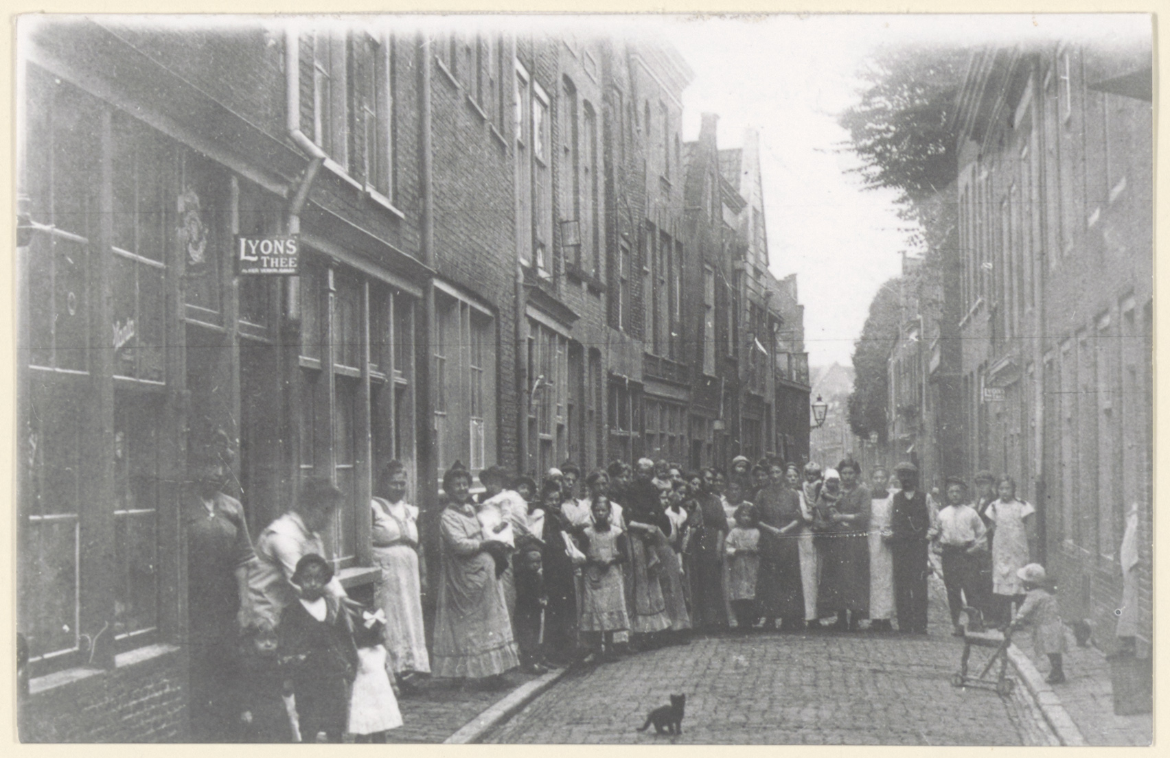 De Kolfstraat in de richting van de Vest met een cirkel belangstellenden voor de opname.