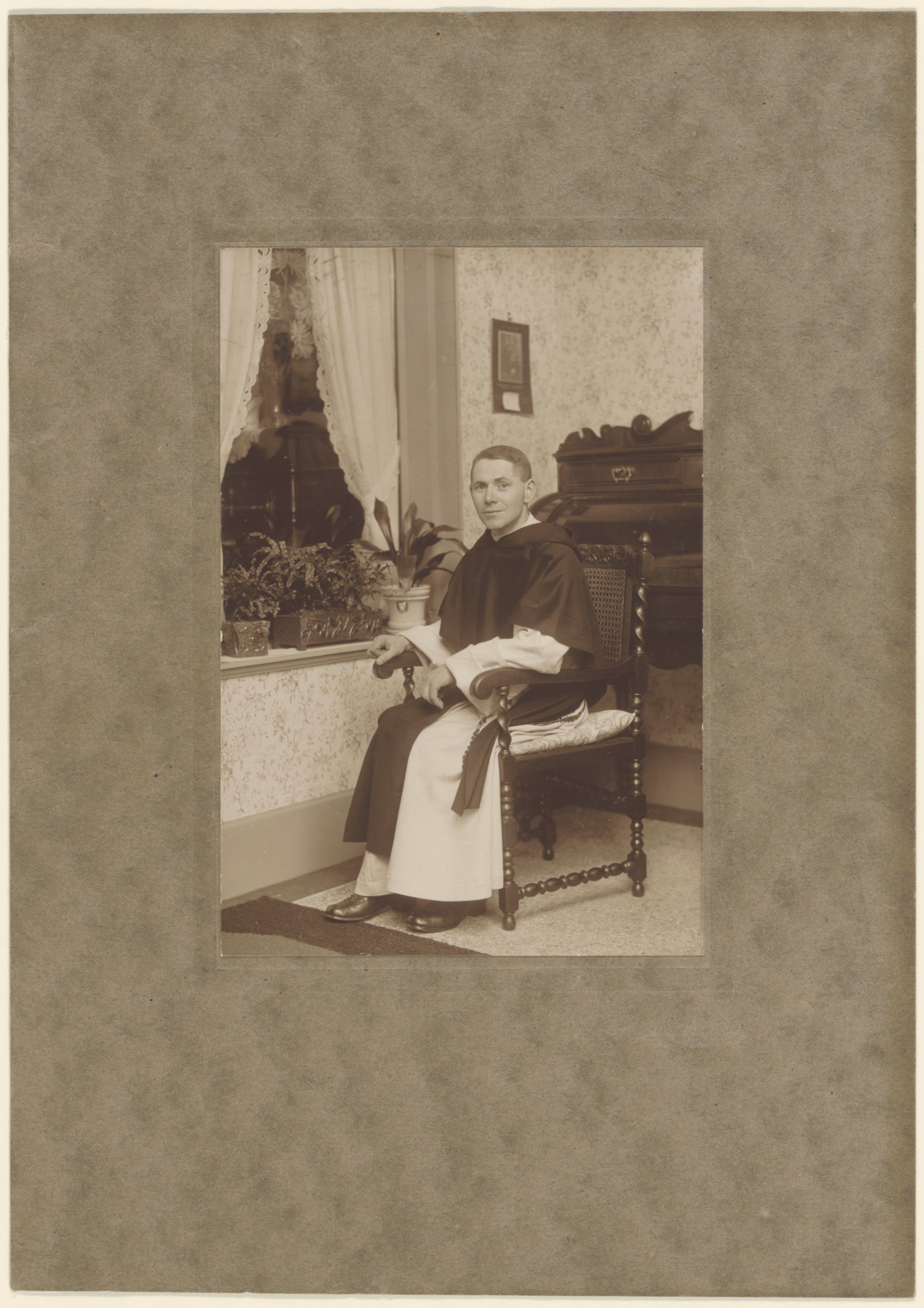 - Portret van een onbekende pater van ca. 25 jaar oud in een stoel voor een secretaire naast een venster met plantjes en vitrage.