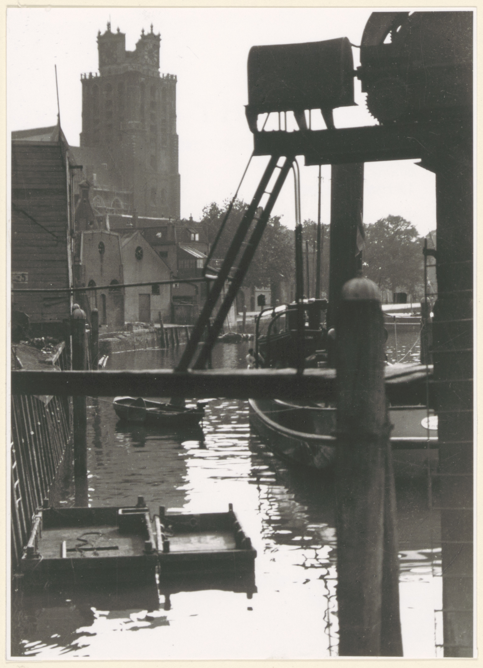Zuidwestelijk deel van de Nieuwe Haven, gezien van of van nabij de Lange IJzerenbrug naar de Houttuinen en Grote Kerk.