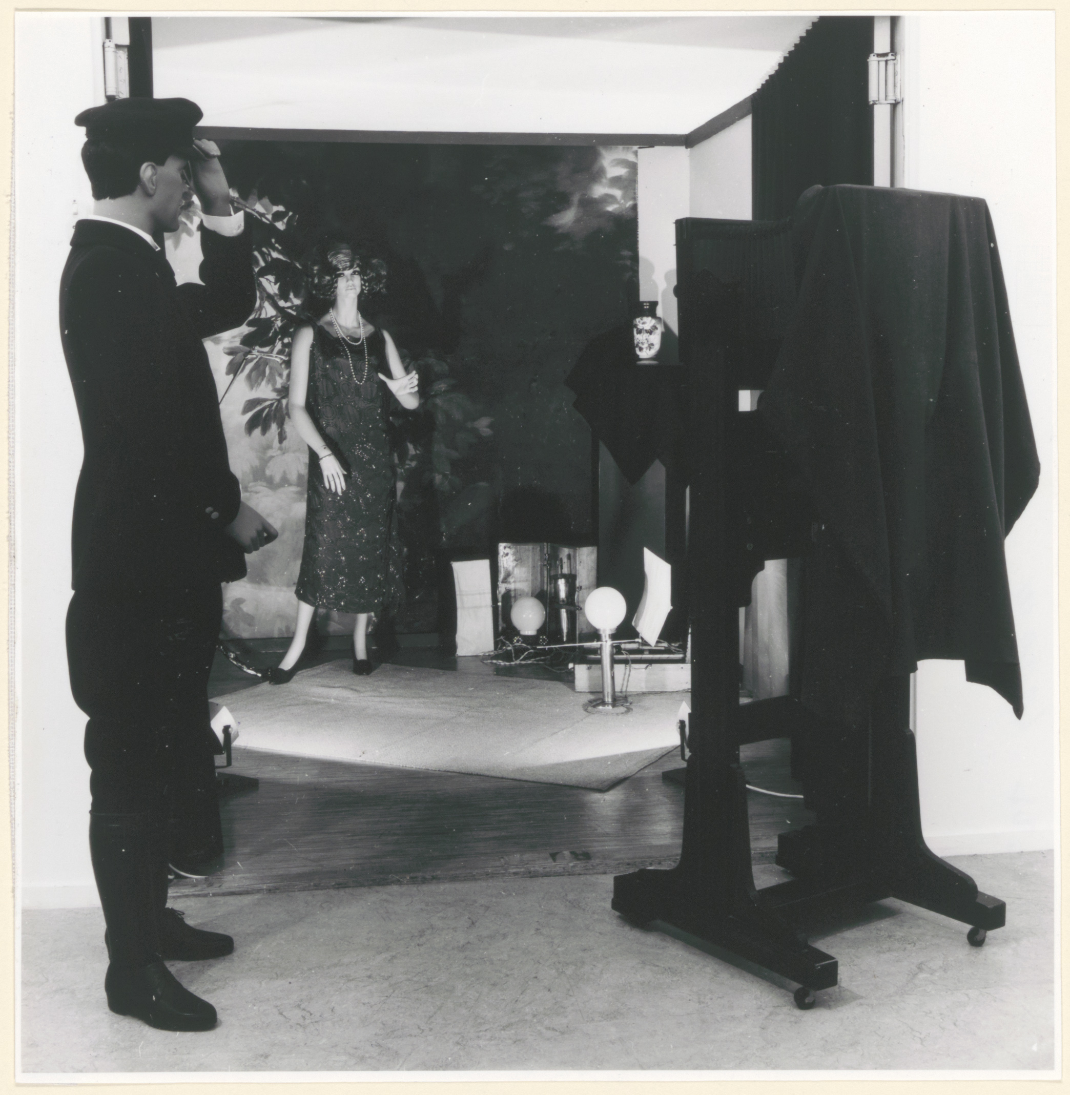 Een nagebouwde fotostudio op de tentoonstelling 'Foto Beerman 1923-1973' die van 2 t/m 30 mei 1973 werd gehouden in het Leprooshuis in de Vriesestraat, georganiseerd door de Gemeentelijke Archiefdienst. De etalagepoppen zijn in bruikleen gegeven door C&A en Hollekamp-Overwijn.