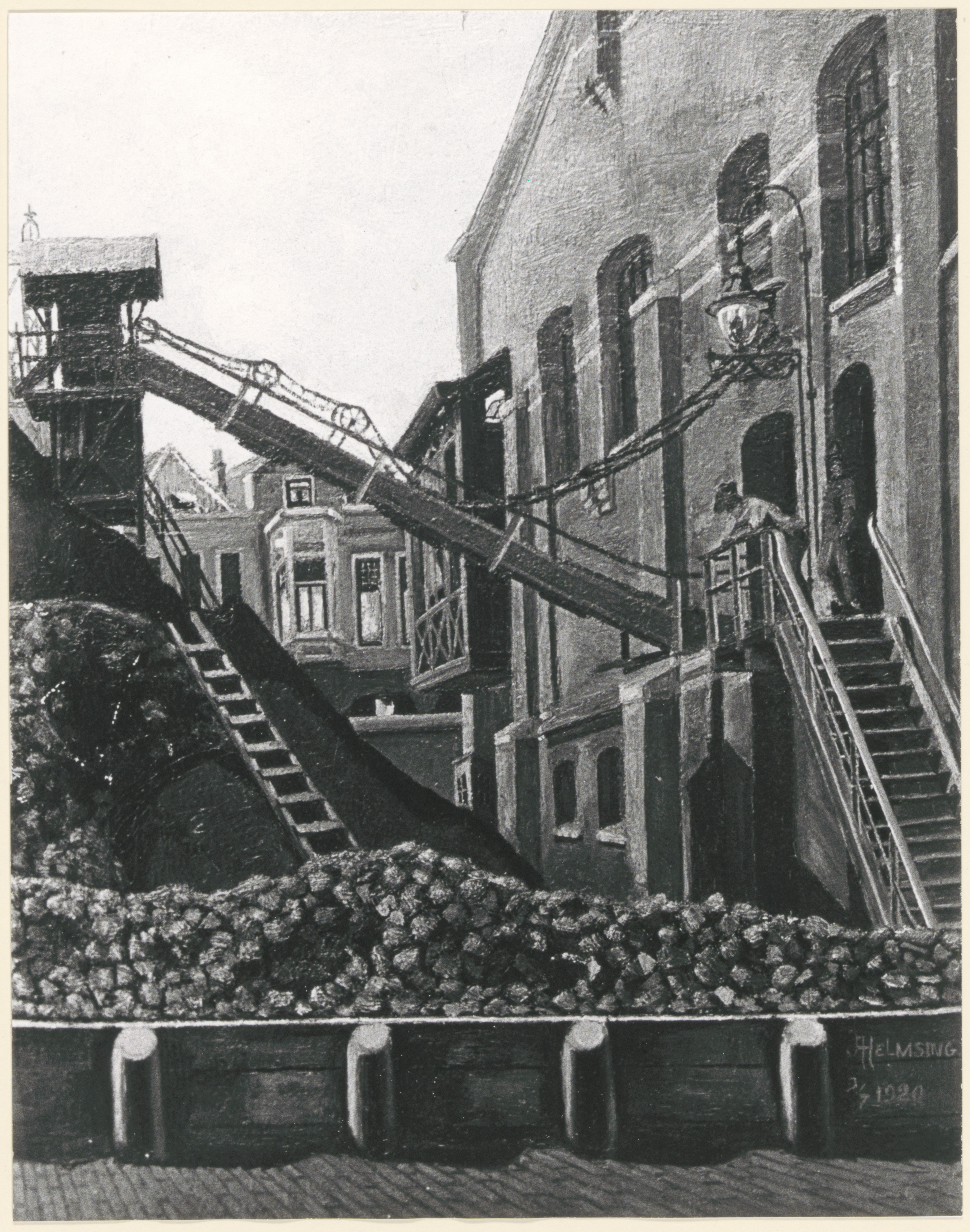 - Een deel van de gasfabriek tussen Merwekade en Riedijk (achtergrond); centraal een transportband voor steenkool (03-07-1920).