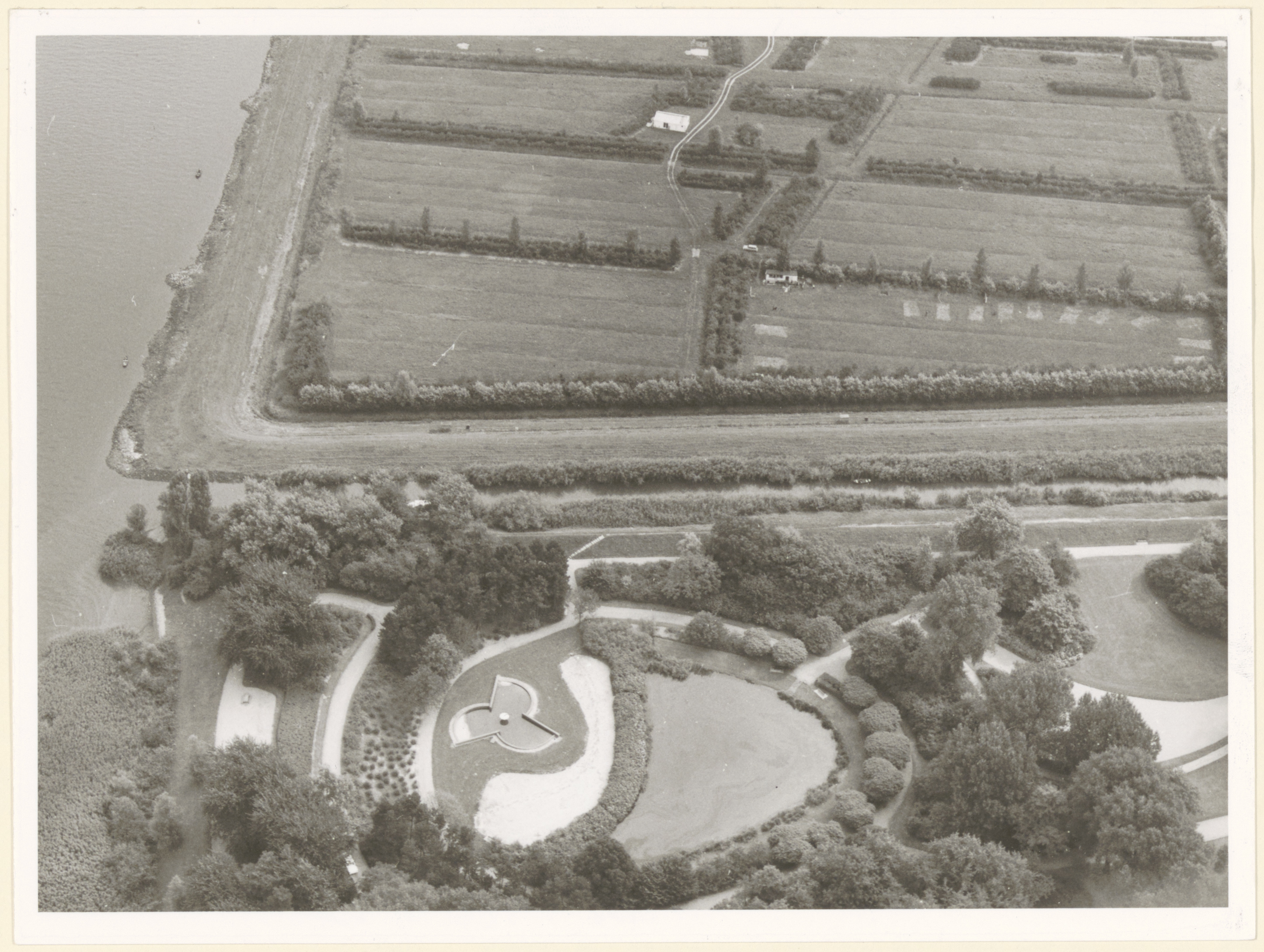 - Luchtfoto van het oostelijke deel van het Wantijpark naar het zuidoosten; onder een sikkelvormige vijver in het park met daarnaast een kleiner vijvertje met een paddestoelvormige fontein; links het Wantij en boven het westelijk deel van de polder waar jeugddorp ligt.