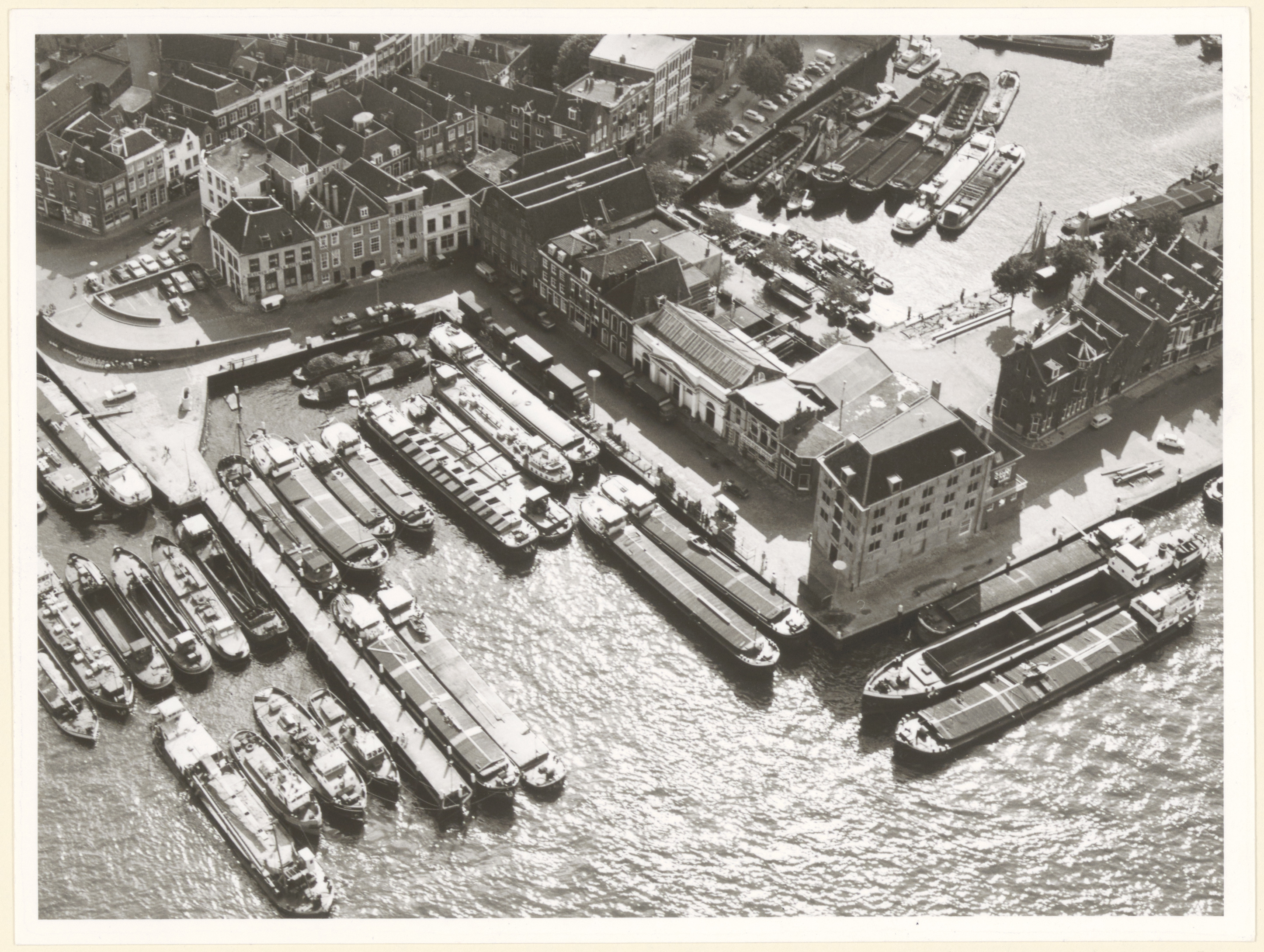 - Luchtfoto van de Bomhaven en omgeving, gezien naar het zuidoosten; onder de Oude Maas, links de Leuvehaven, linksboven de Prinsenstraat en rechtsboven de Kalkhaven; rechts de Buiten Kalkhaven.