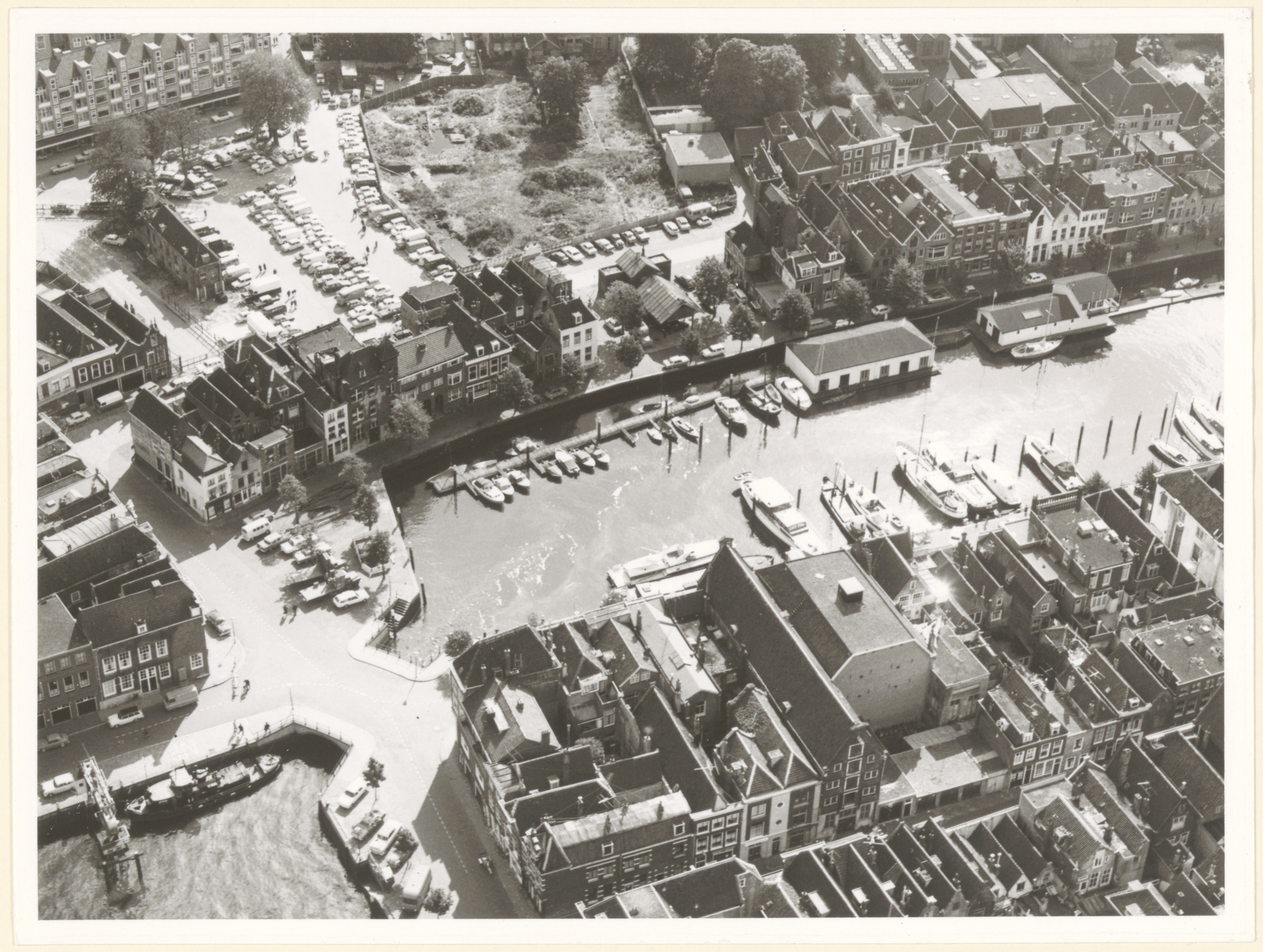 Luchtfoto van de Nieuwe Haven en omgeving, gezien naar het zuidoosten; linksonder de Wolwevershaven en het Vlak, links de Aardappelmarkt en boven links de Grote Markt; rechtsonder de Hoge Nieuwstraat en rechtsboven de Varkenmarkt.