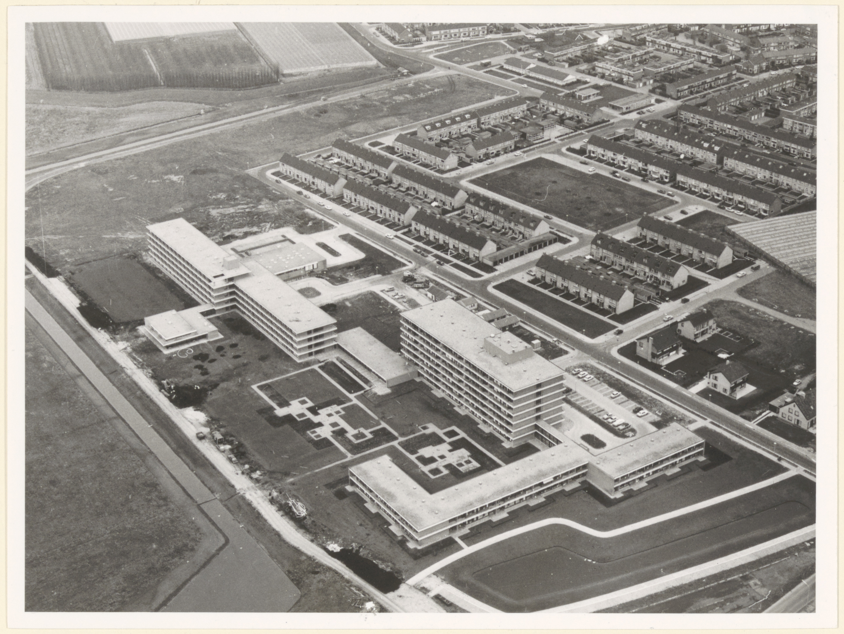 - Luchtfoto van het westelijk deel van Dubbeldam, gezien naar het noordoosten; op de voorgrond ligt het bejaardencomplex Dubbelmonde aan de Koningstraat, daarachter de bebouwing rond de Damstraat; links de Burgemeester Beelaertssingel; linksboven de kassen aan de Haaswijkweg.