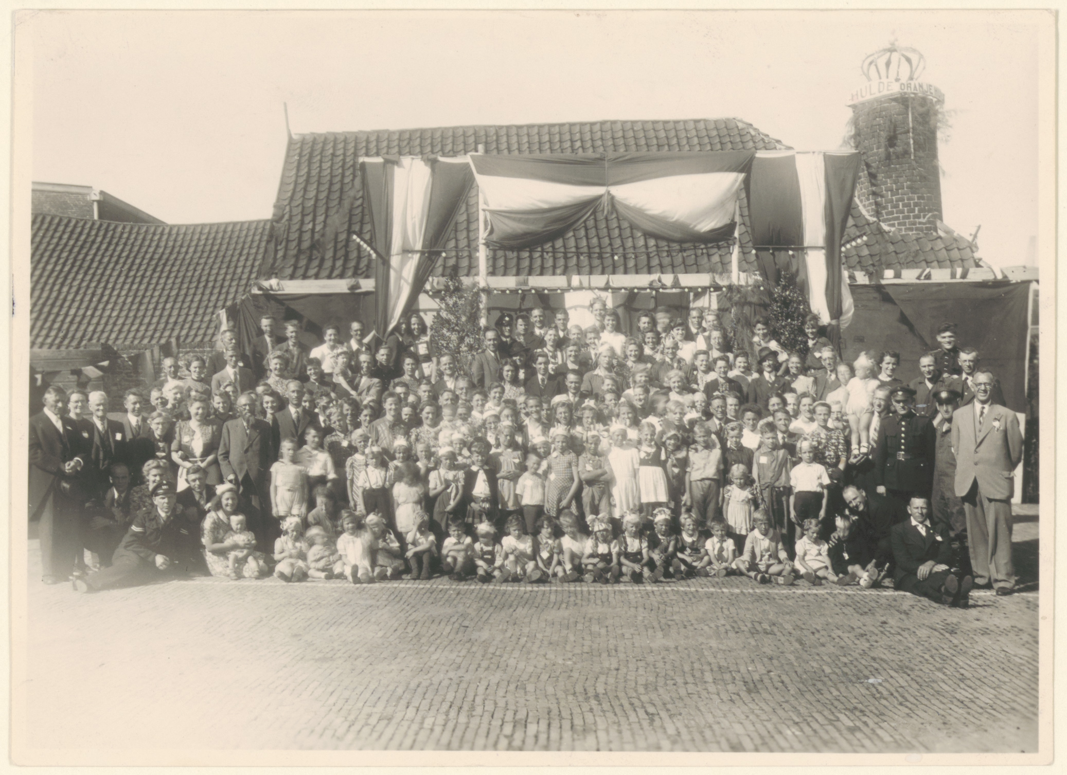 - Portret van brandweerlieden en buurtbewoners op het terrein van de brandweer aan de Vest ter gelegenheid van de viering van de bevrijding op 21 juli 1945.