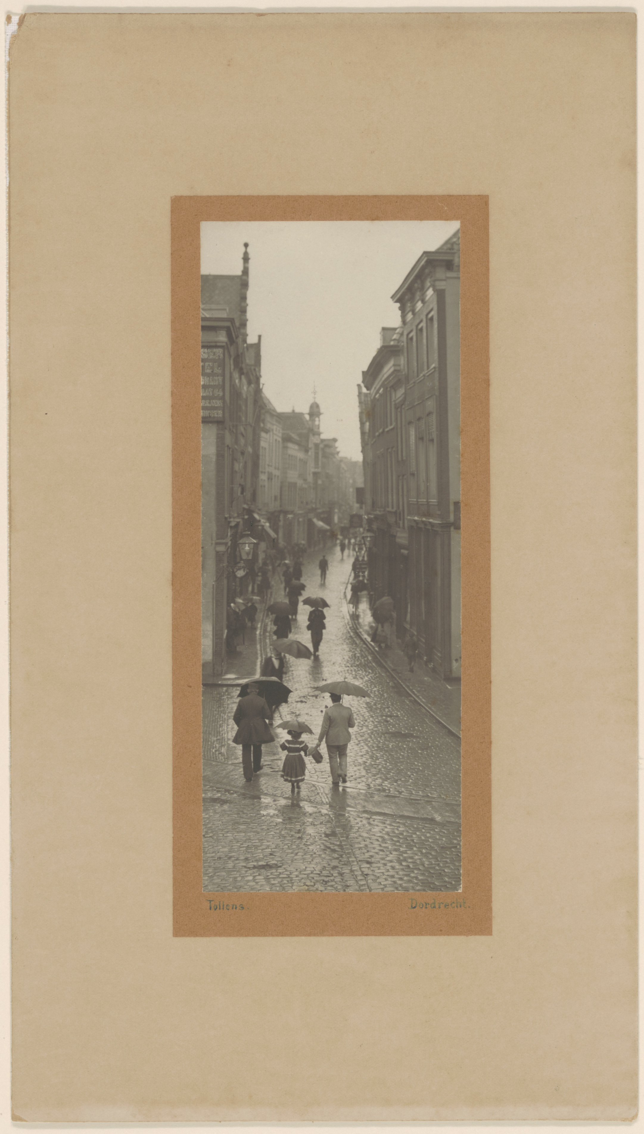 Een regenachtige Voorstraat, gezien van de Visbrug richting Scheffersplein. Op de voorgrond de rails van de paardentram.