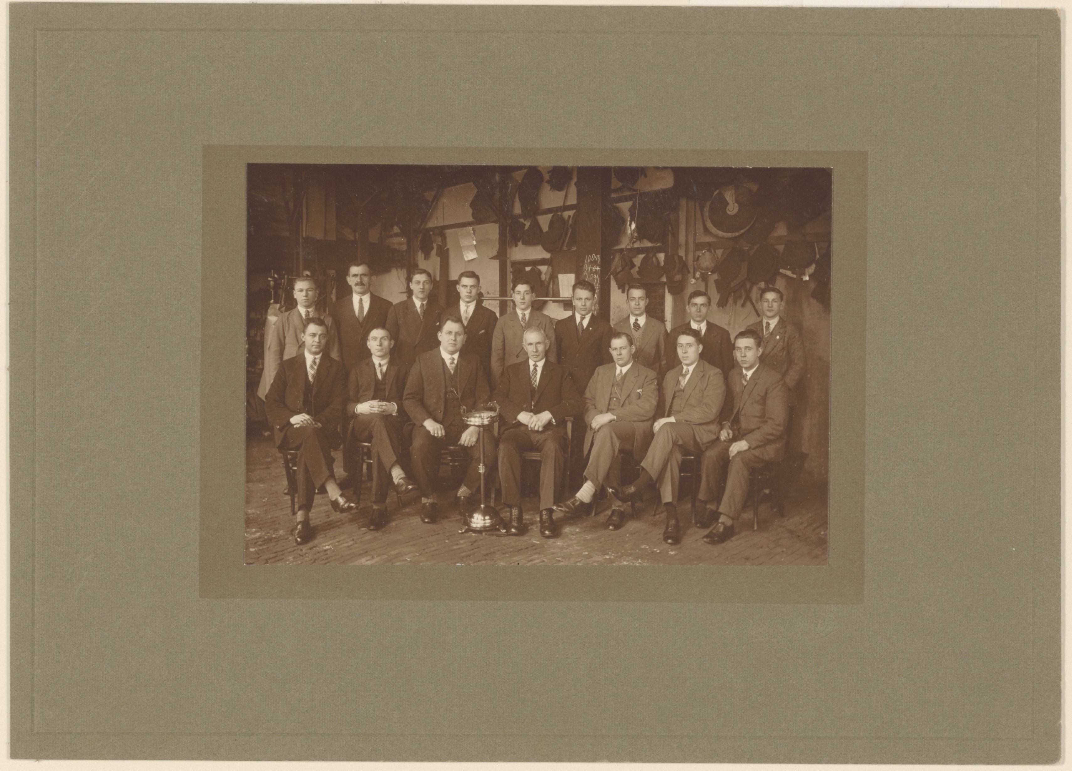 Personeel en directie van Koper- en Blikslagerij Zock in de bedrijfsruimte aan de Bleijenhoek bij het 25-jarig bestaan in 1925; zittend 3e van rechts Ph. Zock.