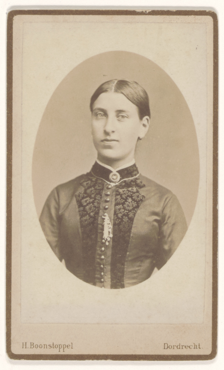 Mejuffrouw Verloop, een ca. 20-jarige jonge vrouw met hooggesloten japon en glad haar …