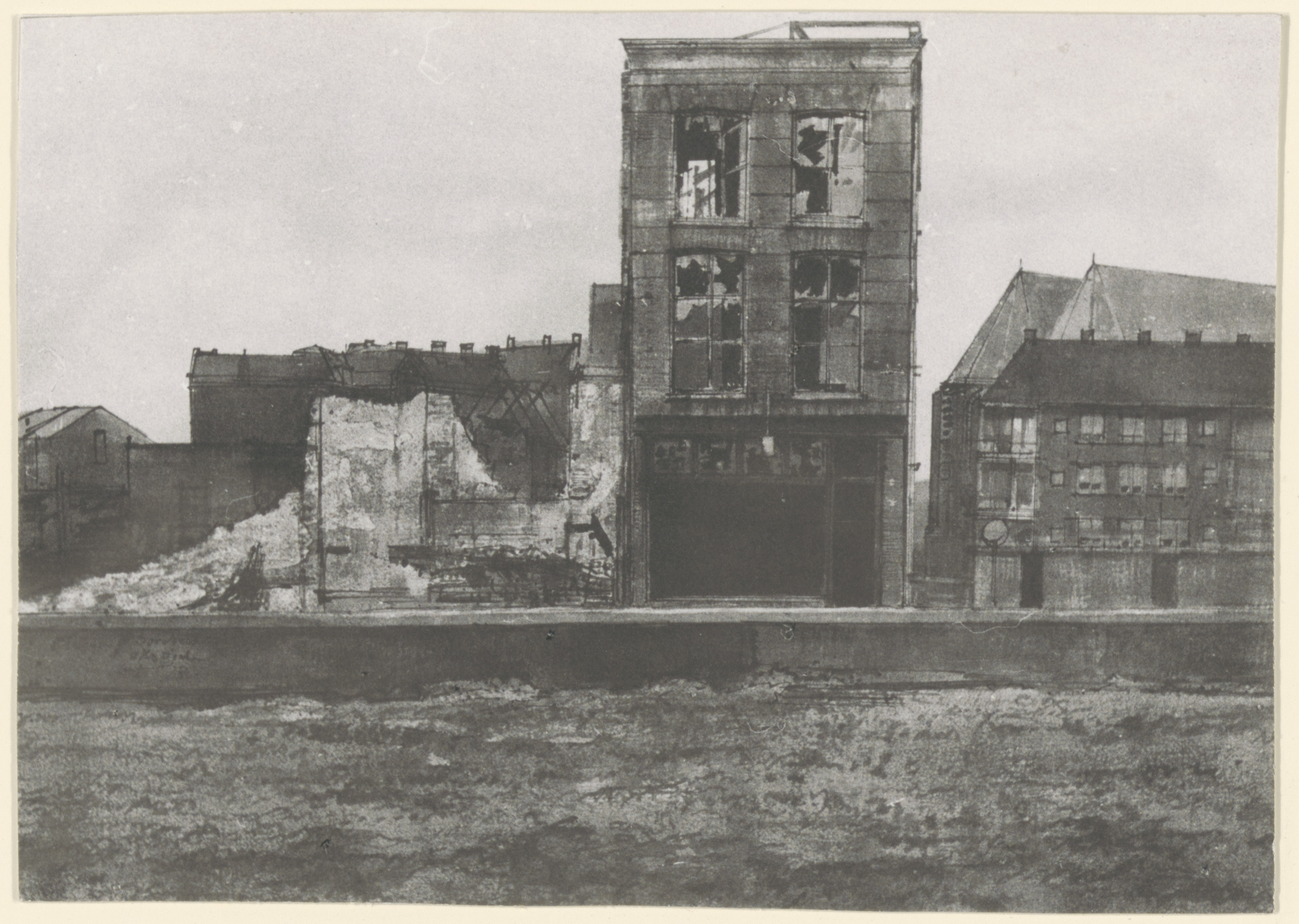 - Afbraak van huizen aan het oosteinde van de Riedijk, gezien vanaf de Merwekade over de kaalslag van de gasfabriek. Rechts de huizen aan de Torenstraat met daarachter de oostkant van de Nieuwkerk.