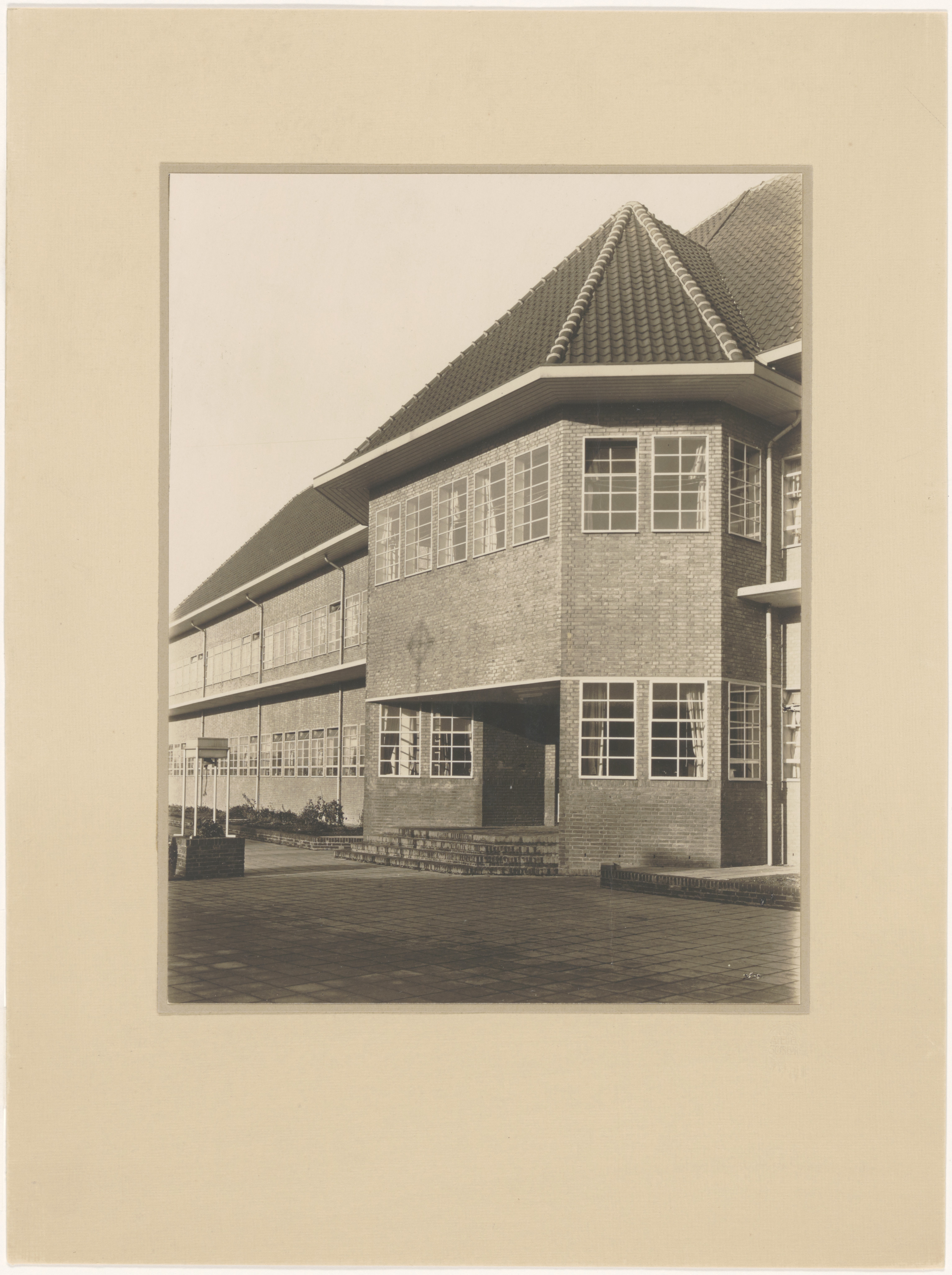 De ingang met links de schoolbel van de op 28 februari 1931 in gebruik genomen dubbele …