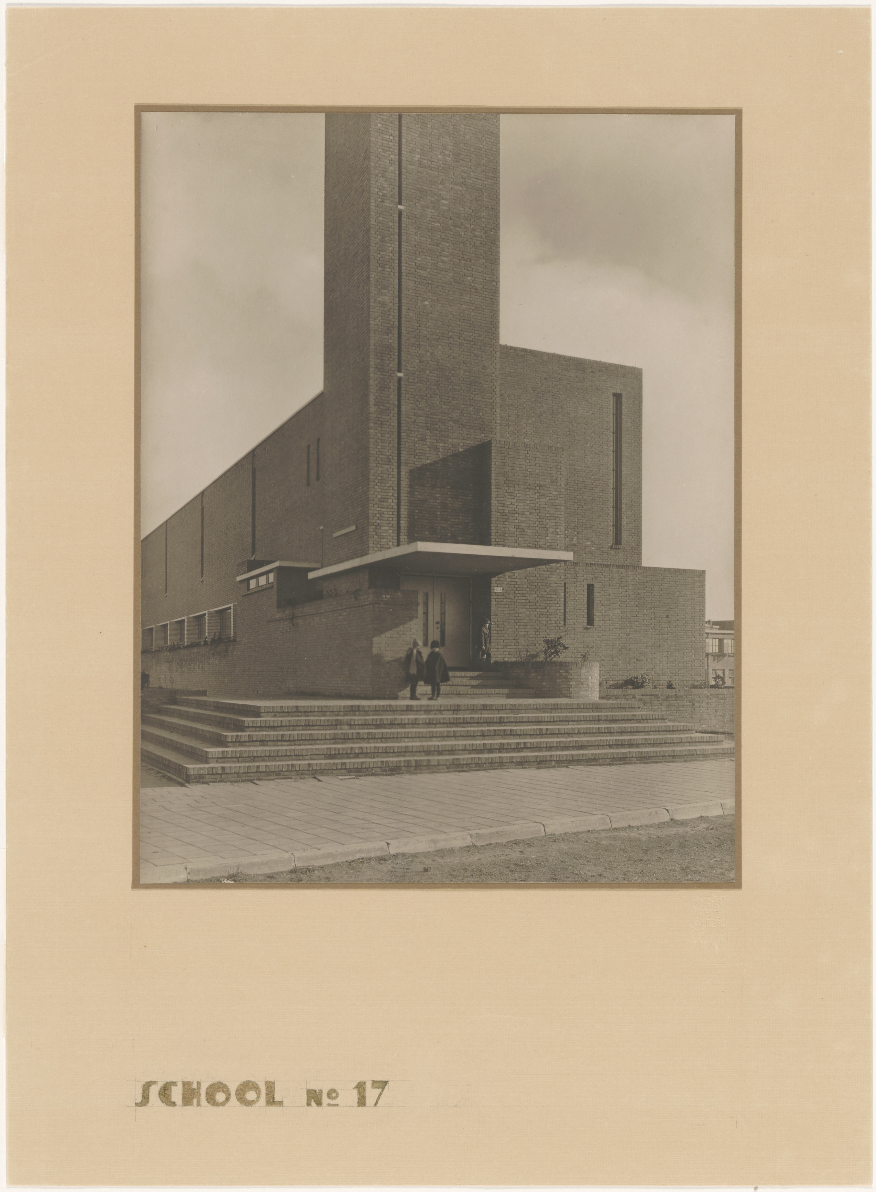 De ingang in de toren van school nr. 17 voor lager onderwijs, de Torenschool, aan de Brouwersdijk hoek Bosboom-Toussaintstraat (links), gebouwd in 1928/1929.