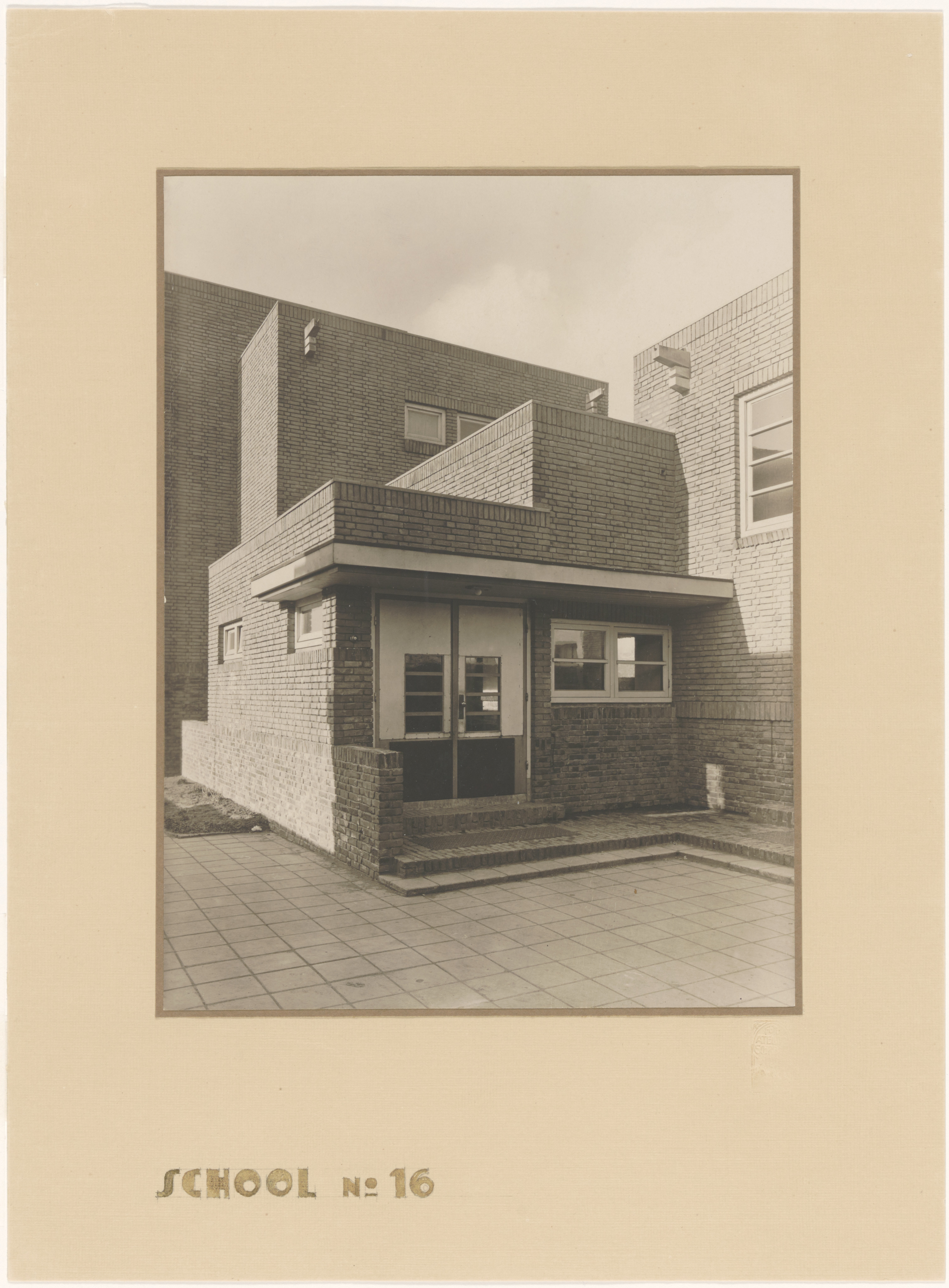 De ingang vanaf de speelplaats gezien van de openbare lagere Prinses Margrietschool op de hoek van de Bosboom-Toussaintstraat en de Jacob van Lennepstraat; na de bouw in 1926/1927 school nr. 16 genoemd.