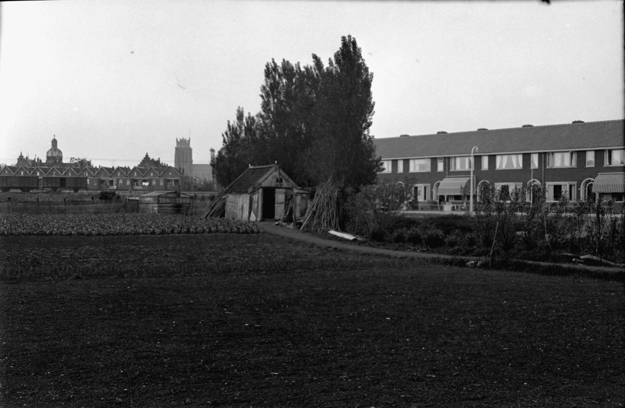Restant van de Watermolenweide en de aan een kant bebouwde Marnixstraat. Links achter de goederentrein is de Havenstraat, waar het torentje van Rozenhof bovenuit steekt. Meer naar rechts de Grote Kerk.