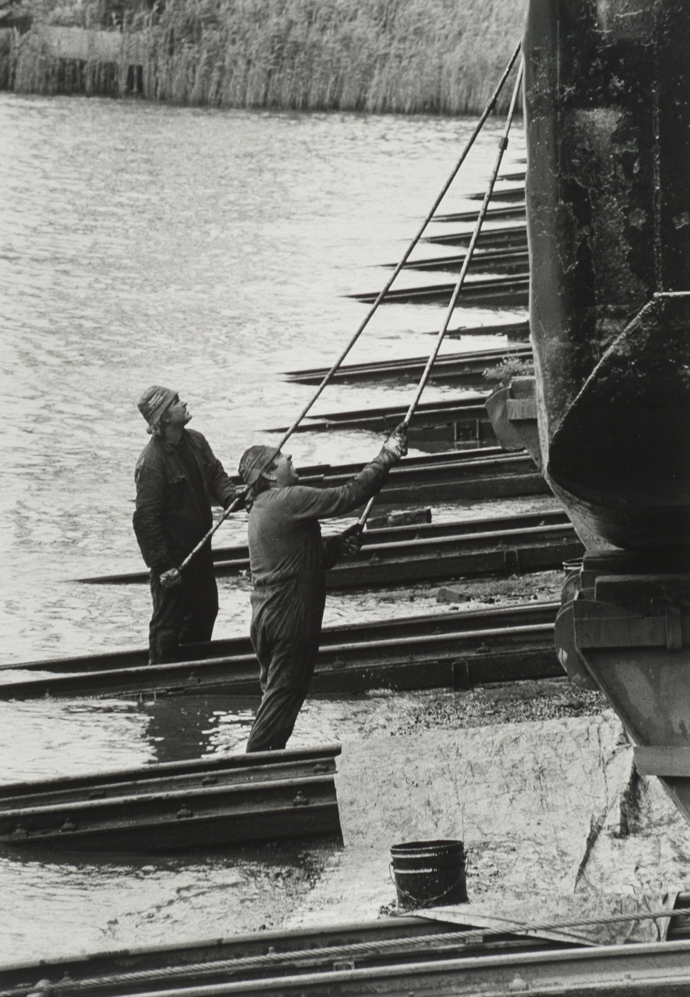 Waarschijnlijk dwarshelling bij scheepswerf de Biesbosch aan het Wantij waar twee man de scheepshuid in de koolteer aan het zetten zijn (koolteer mag sinds 1-7-1997 niet meer toegepast worden).