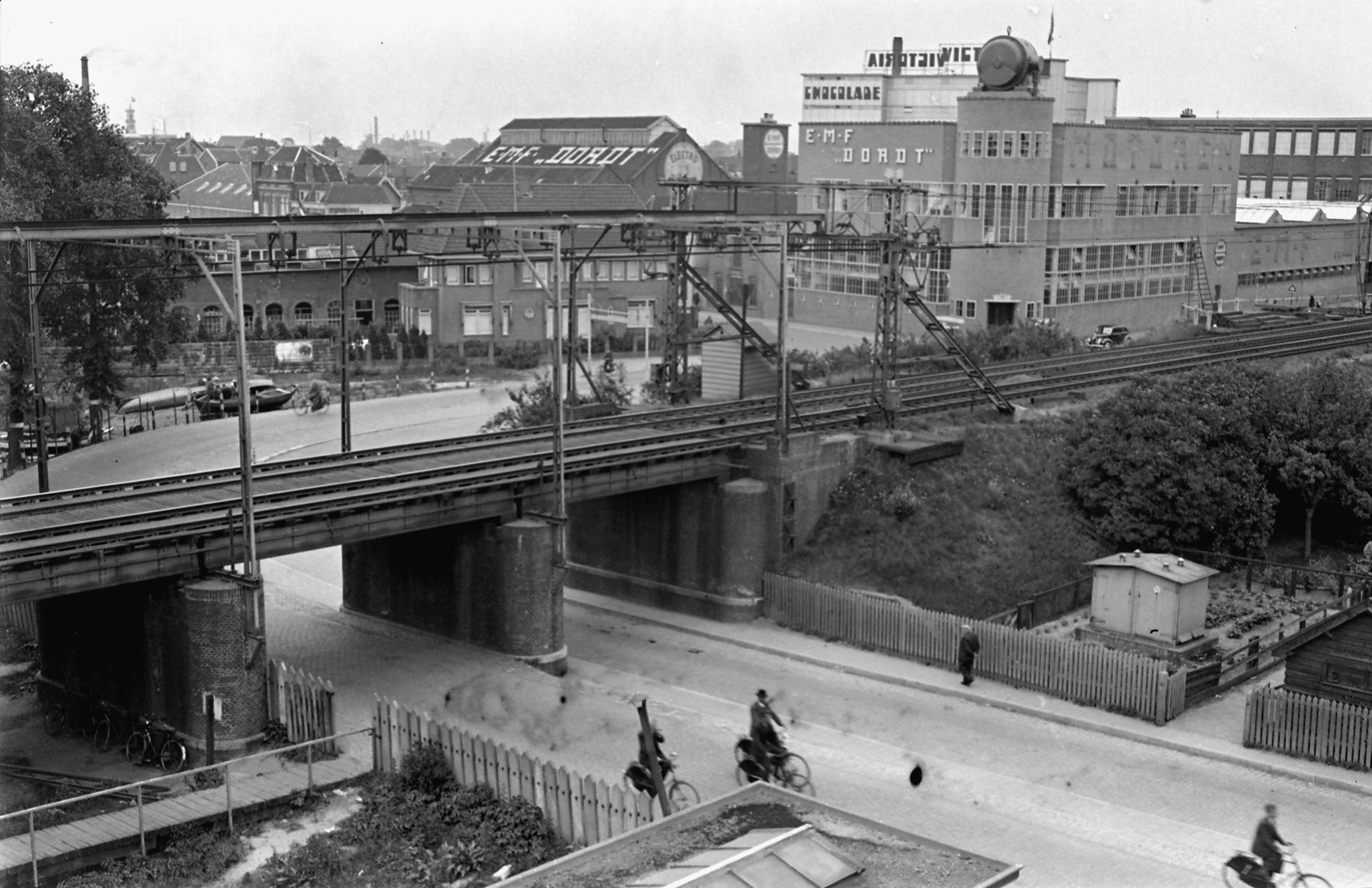 - Spoorwegviaduct over de Dokweg, gezien vanaf de verkeersbrug richting Achterhakkers. De fabrieken EMF en Victoria staan op de achtergrond aan de Korte Parallelweg.