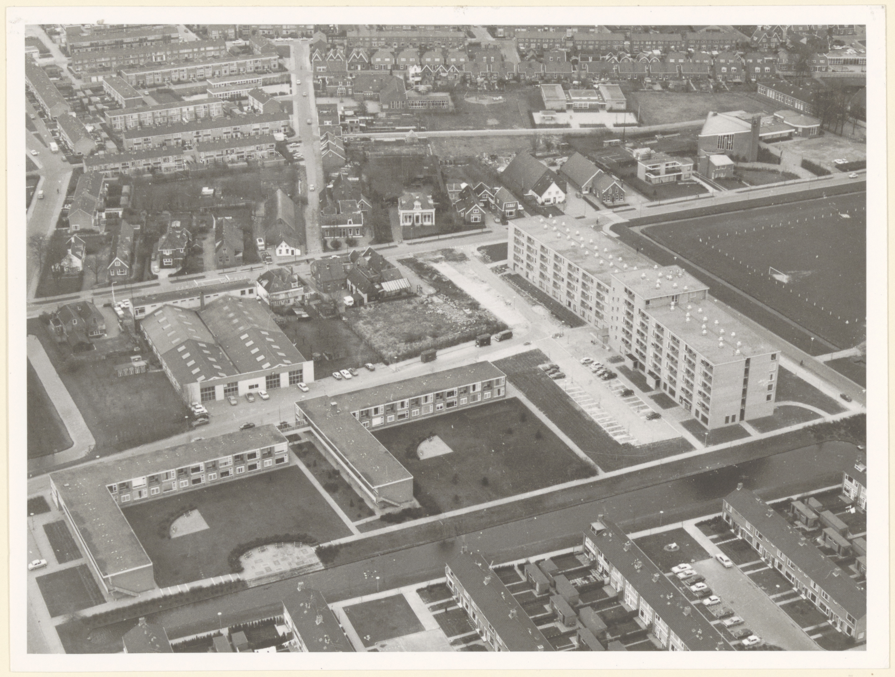 Luchtfoto van het zuidwestelijk deel van Dubbeldam, gezien naar het noordoosten; centraal verzorgingstehuis De Gravenhorst aan de Gravensingel (rechts) en Zonneweelde (links) aan de Vijverlaan; van links midden naar rechtsboven de Dubbelsteynlaan; rechts een voetbalveld naast het Dubbelsteynpark; boven links de Groene Kruislaan en rechts daarvan de Couperusstraat.