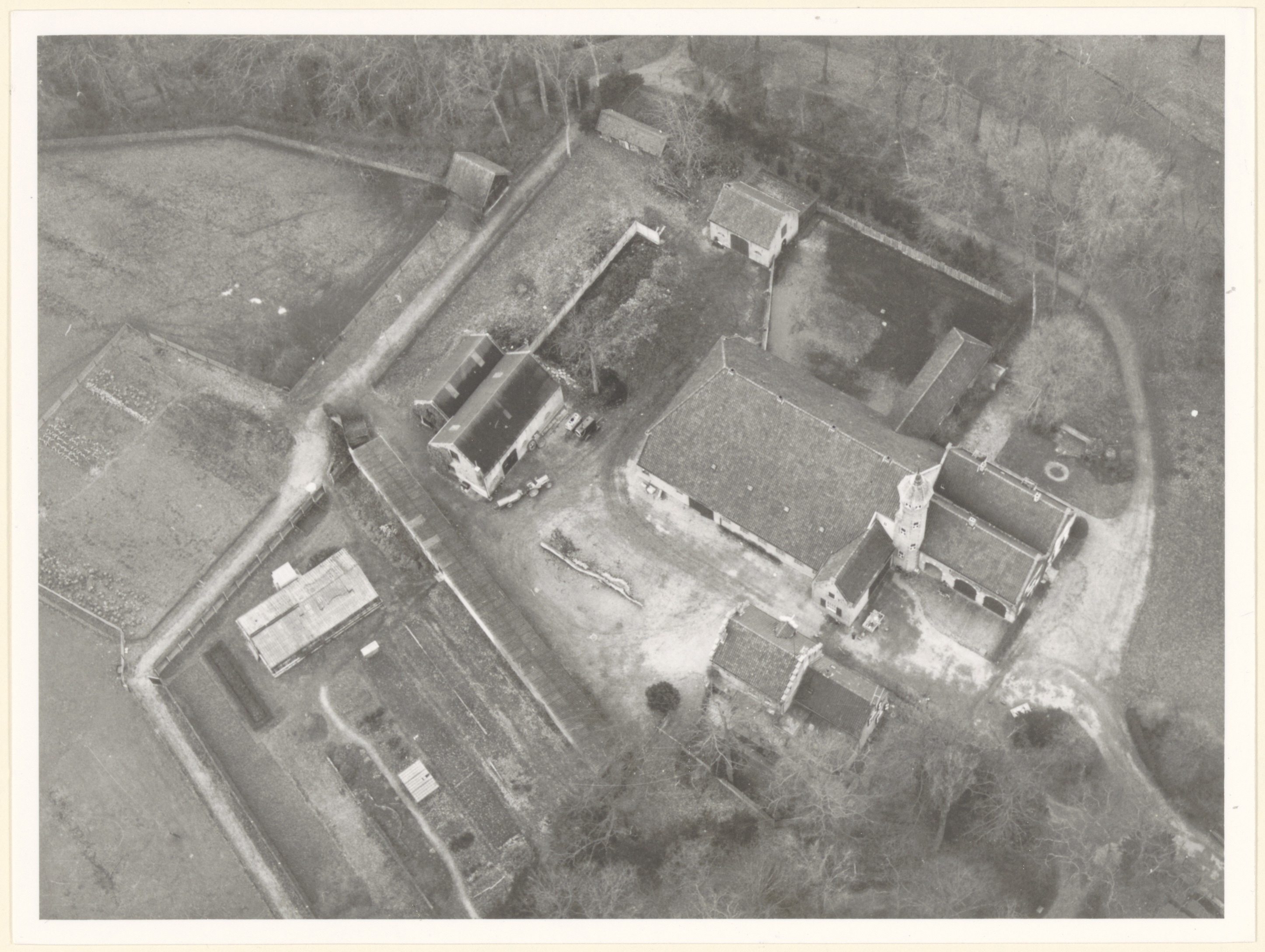 - Luchtfoto van een deel van het landgoed Dordwijk, gezien naar het westen; rechtsonder de 'kasteelboerderij', rechtsonder de toegang tot het landgoed.
