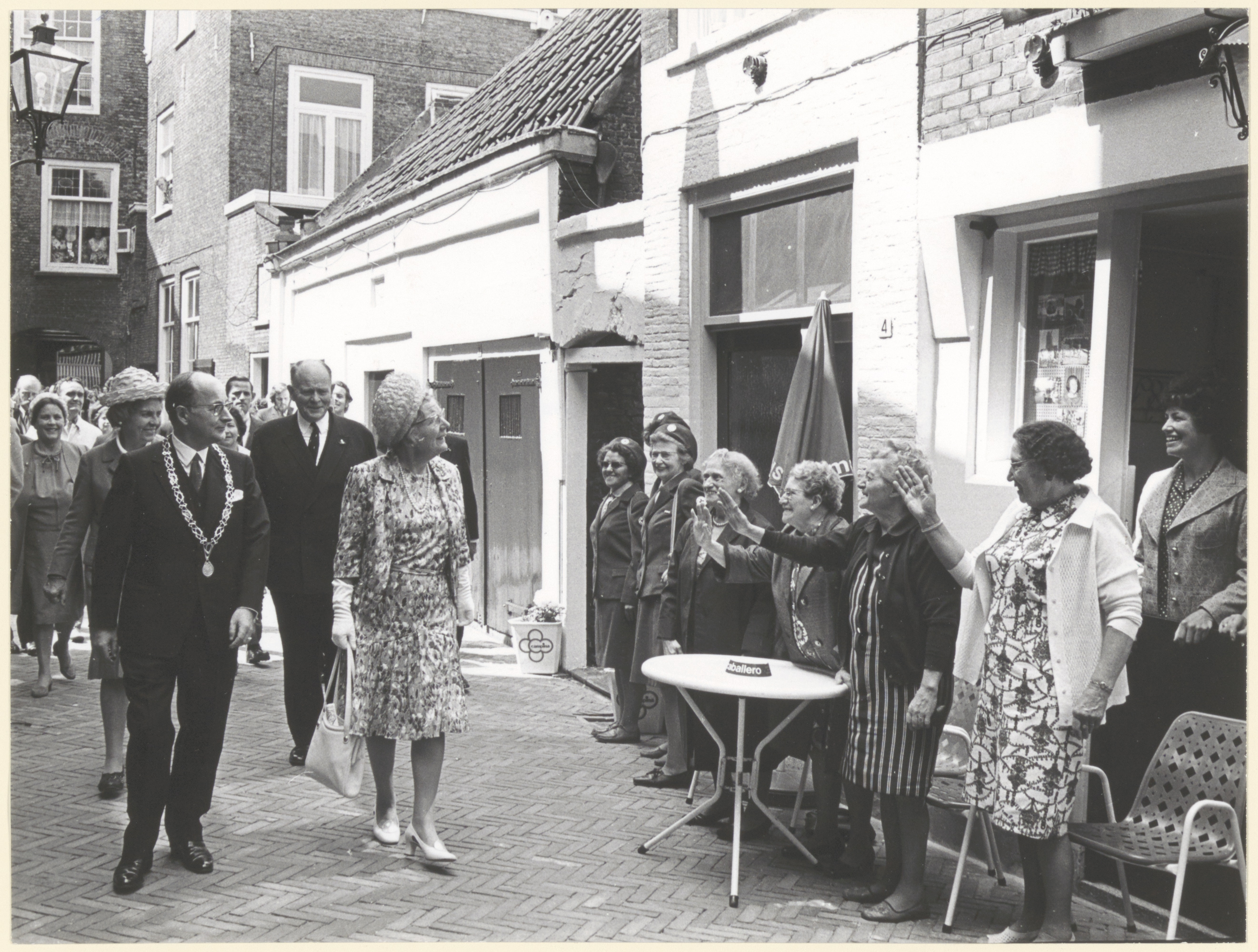 - Enige oudere vrouwen zwaaien koningin Juliana toe, die geflankeerd door burgemeester mr. J.J. v.d. Lee van der Augustijnenkerk door het steegje naar het Hof wandelt; zij bezoekt de tentoonstelling Opstand en Onafhankelijkheid en gaat het gerestaureerde Hof bekijken op 28 juni 1972.