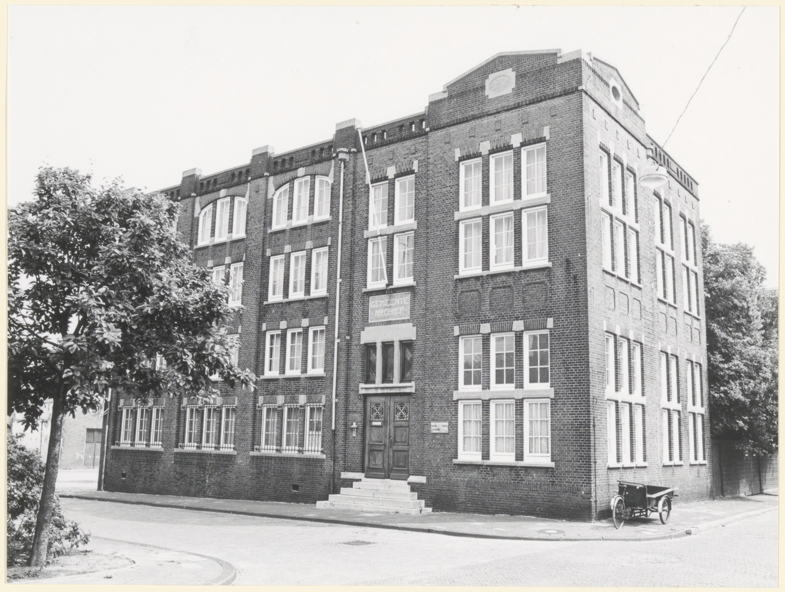 - Het gebouw van de gemeentelijke archiefdienst in het Stek. Links de vroegere Veststraat (later) Verlengde Schoolstraat, rechts de vroegere Stekstraat (later Stek).