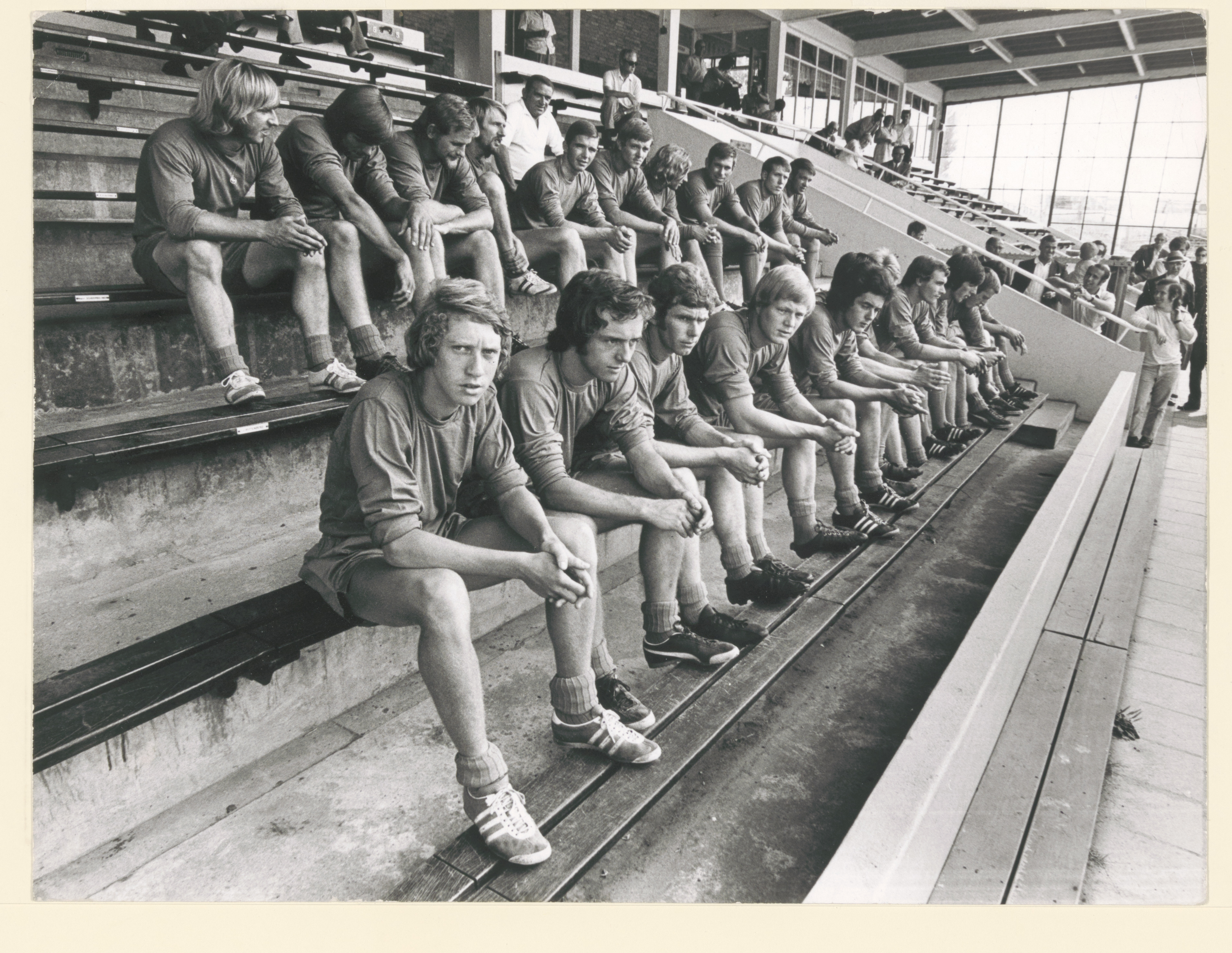 De selectie van de voetbalclub DFC voor het seizoen 1971/1972; twee tientallen op de tribune van het DFC-terrein aan de Krommedijk. Bovenaan in witte jas trainer Ludwig Veg, vooraan links Hans Koster.
