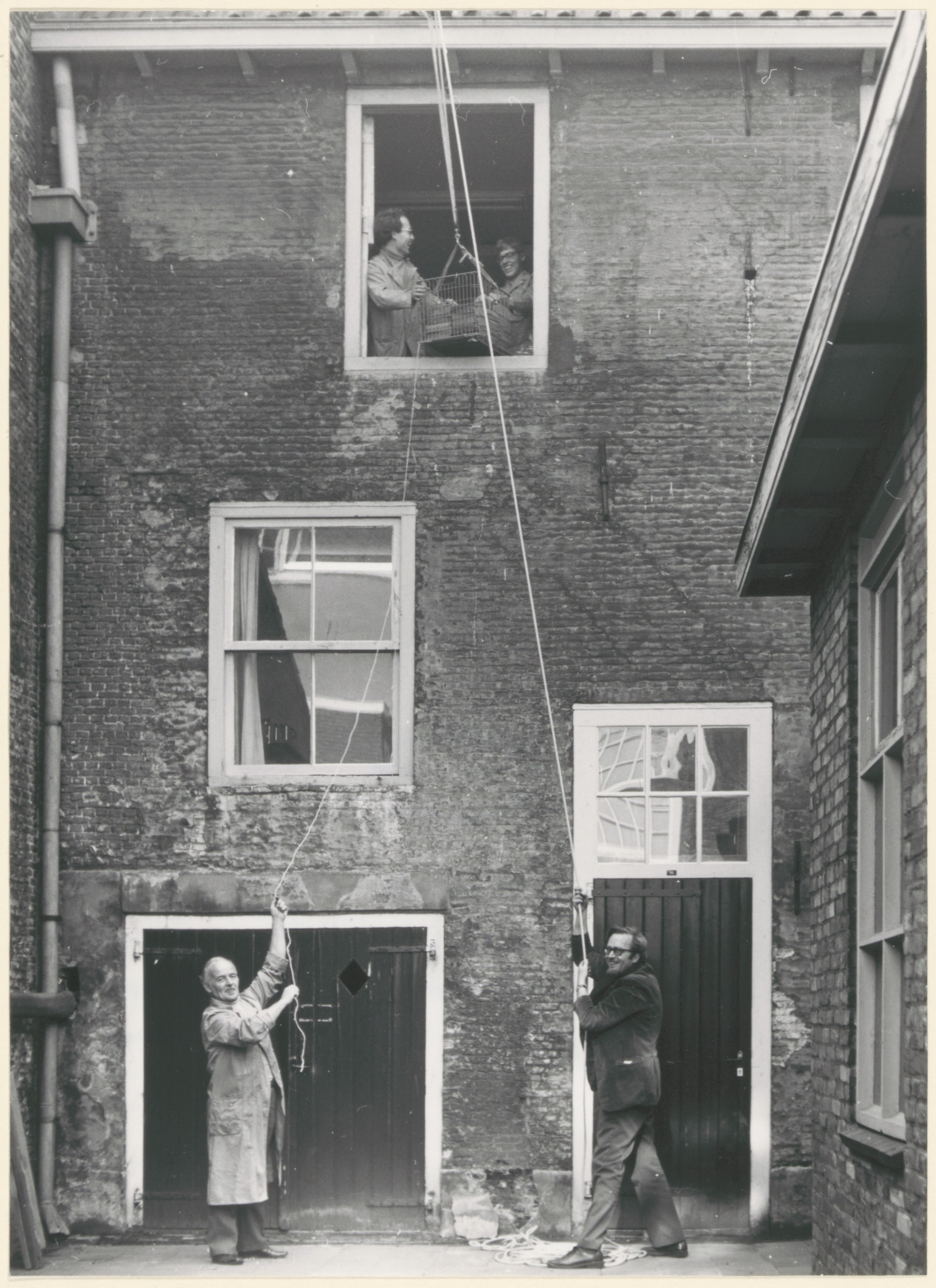 Het optakelen van een mandje met doosjes glasnegatieven uit het archief van fotograaf Beerman van de binnenplaats van het Leprooshof aan de Vriesestraat (waar een deel van de archiefdienst huisde) naar de verdieping van gebouw C (een achter het Lerprooshuis gelegen gebouw); aan de touwen links J. Wegman en rechts dr. Jensma, archivaris en boven links W. Veerman en rechts S. Schillemans.