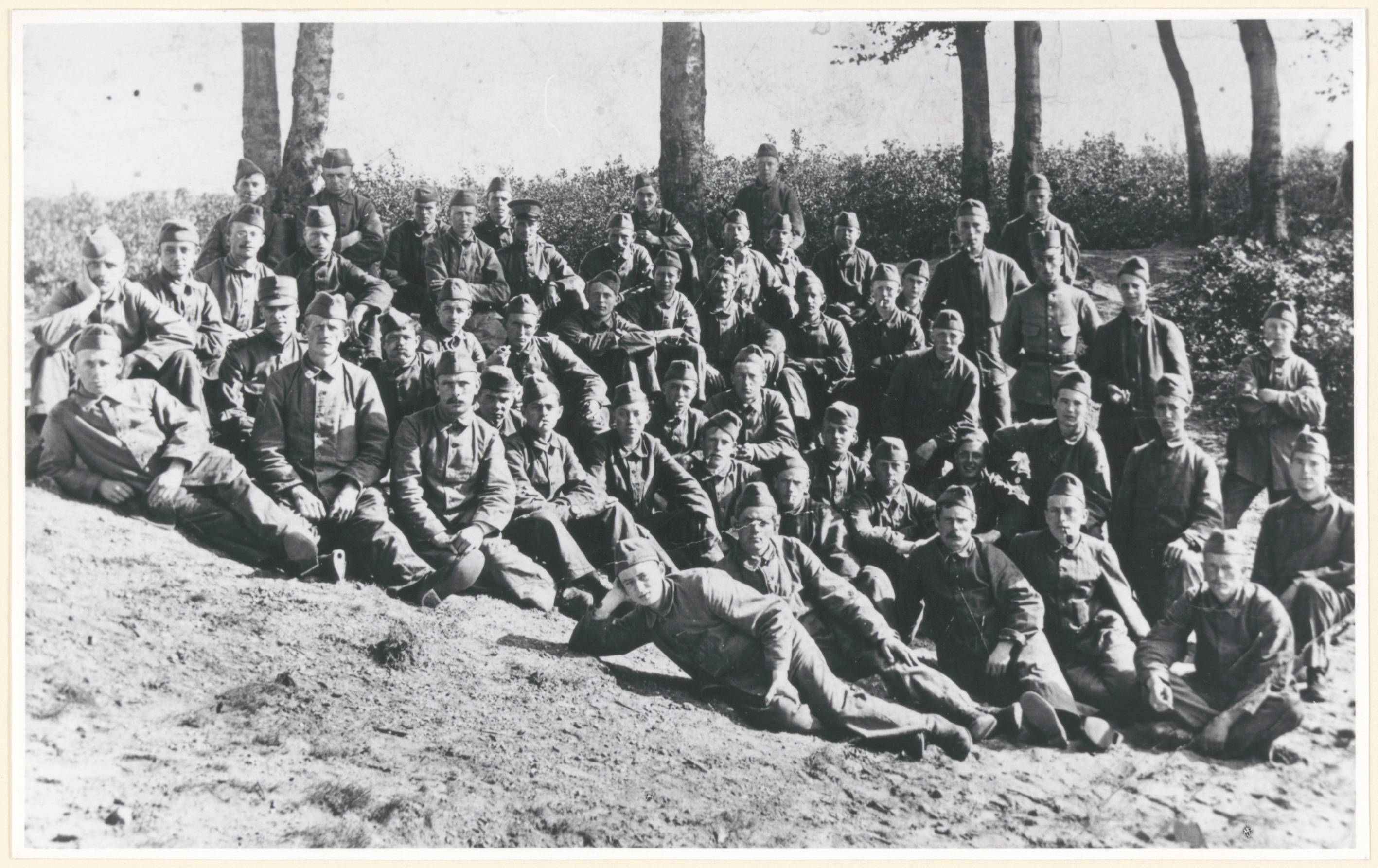 Een groep militairen tijdens de mobilisatie 1914 - 1918, poserend in een zanderig terrein tegen een achtergrond van berken en struiken. Gezien de herkomst zal op deze foto wel voorkomen Dirk Verzijl (geb. 4 juli 1888 te Heinenoord), die van 1913 tot 1916 te Velzen (mogelijk zijn mobilisatiebestemming) verbleef; later werd hij stratenmaker en aannemer.