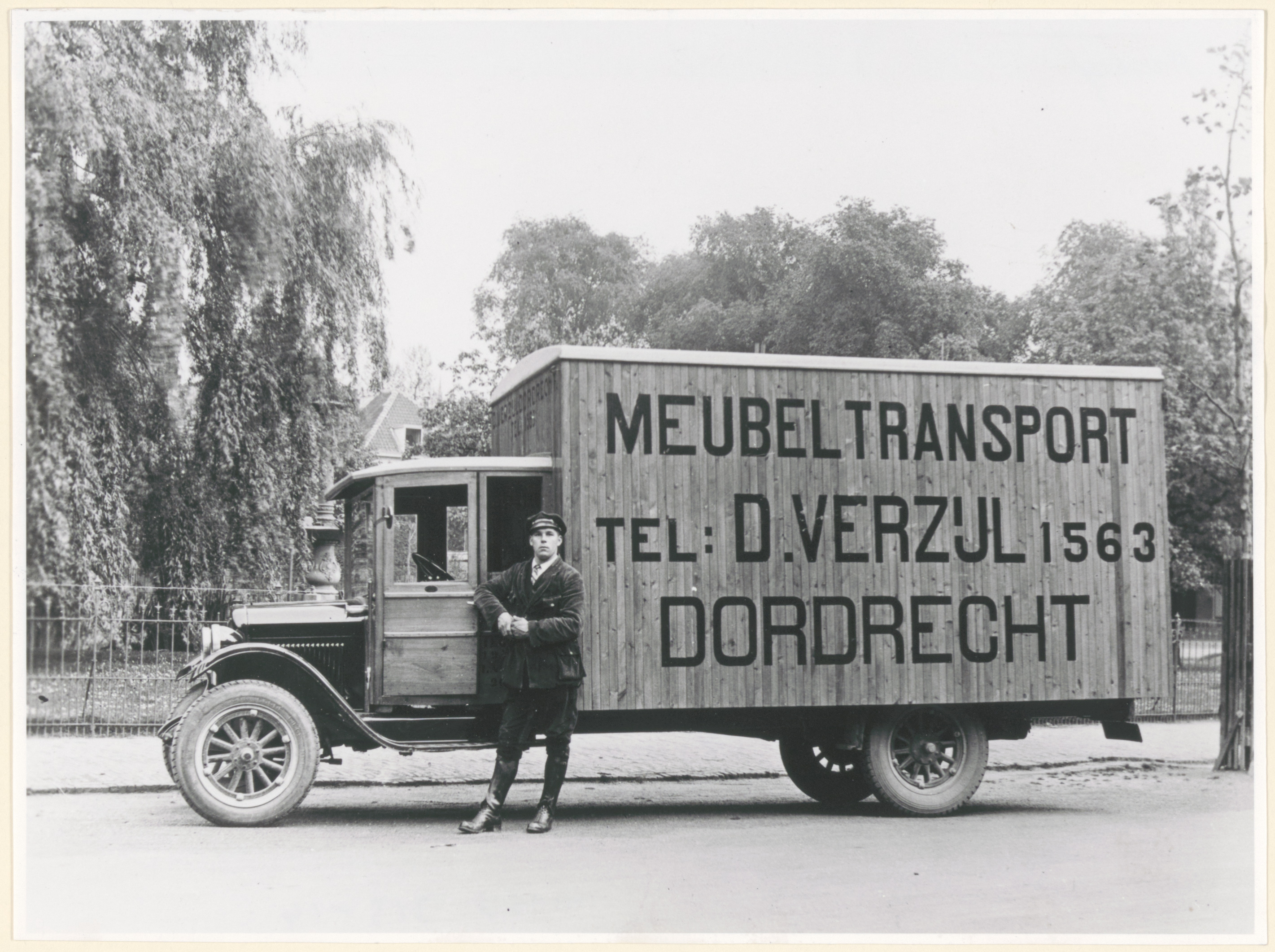 Een meubeltransportauto van firma D. Verzijl op het Beverwijcksplein. Voor de auto chauffeur P. de Bruin.