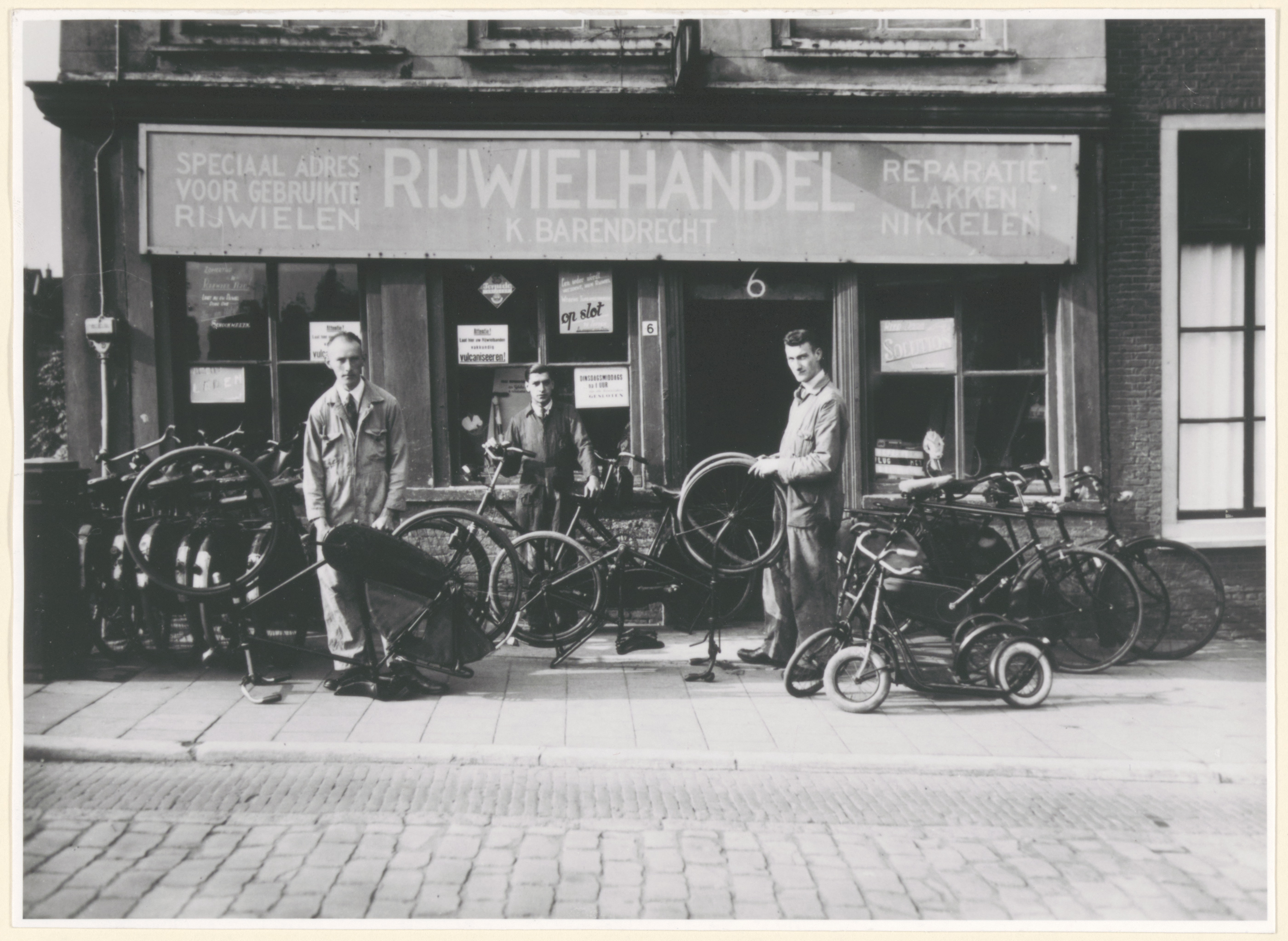 De rijwielhandel K. Barendrecht op de Nieuwbrug 6 (oud. nr.). Op de stoep worden fietsen gerepareerd door links H. Barendrecht, in het midden misschien P. Barendrecht jr. en rechts K(rijn) Barendrecht. Het pand ligt aan de zuidwestkant van de brug aan de Voorstraatshaven (links op de foto).