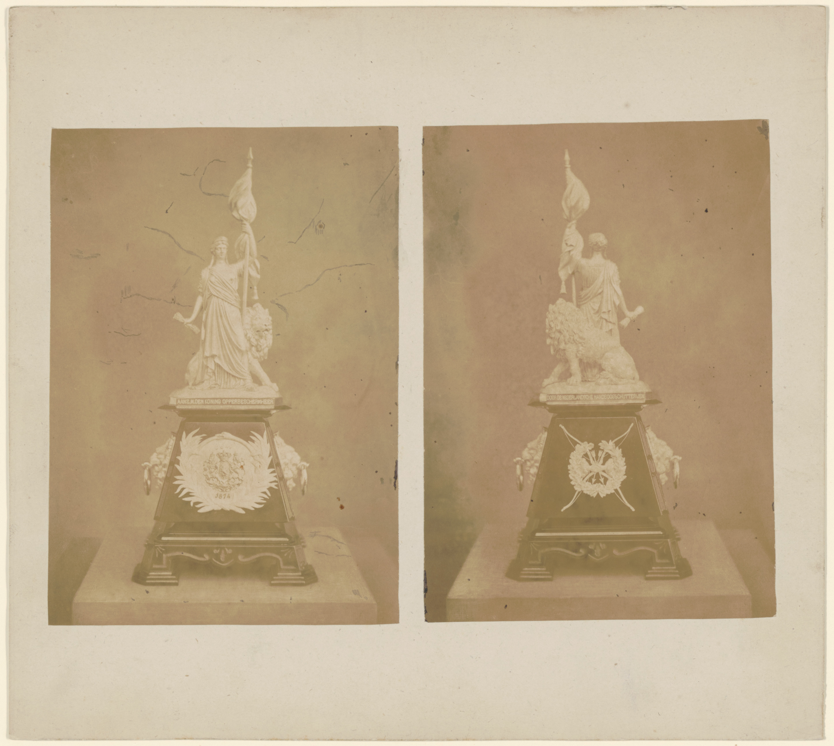 De voor- en achterzijde van een beeld van de Nederlandse maagd en leeuw op een sokkel met de tekst 'aan z.m. den koning opperbeschermheer door de Nederlandsche handboogschutterijen', een wapen met het jaartal 1874 en een schutterijembleem, aan koning Willem III aangeboden bij zijn 25-jarig regeringsjubileum op 12 mei 1874.
