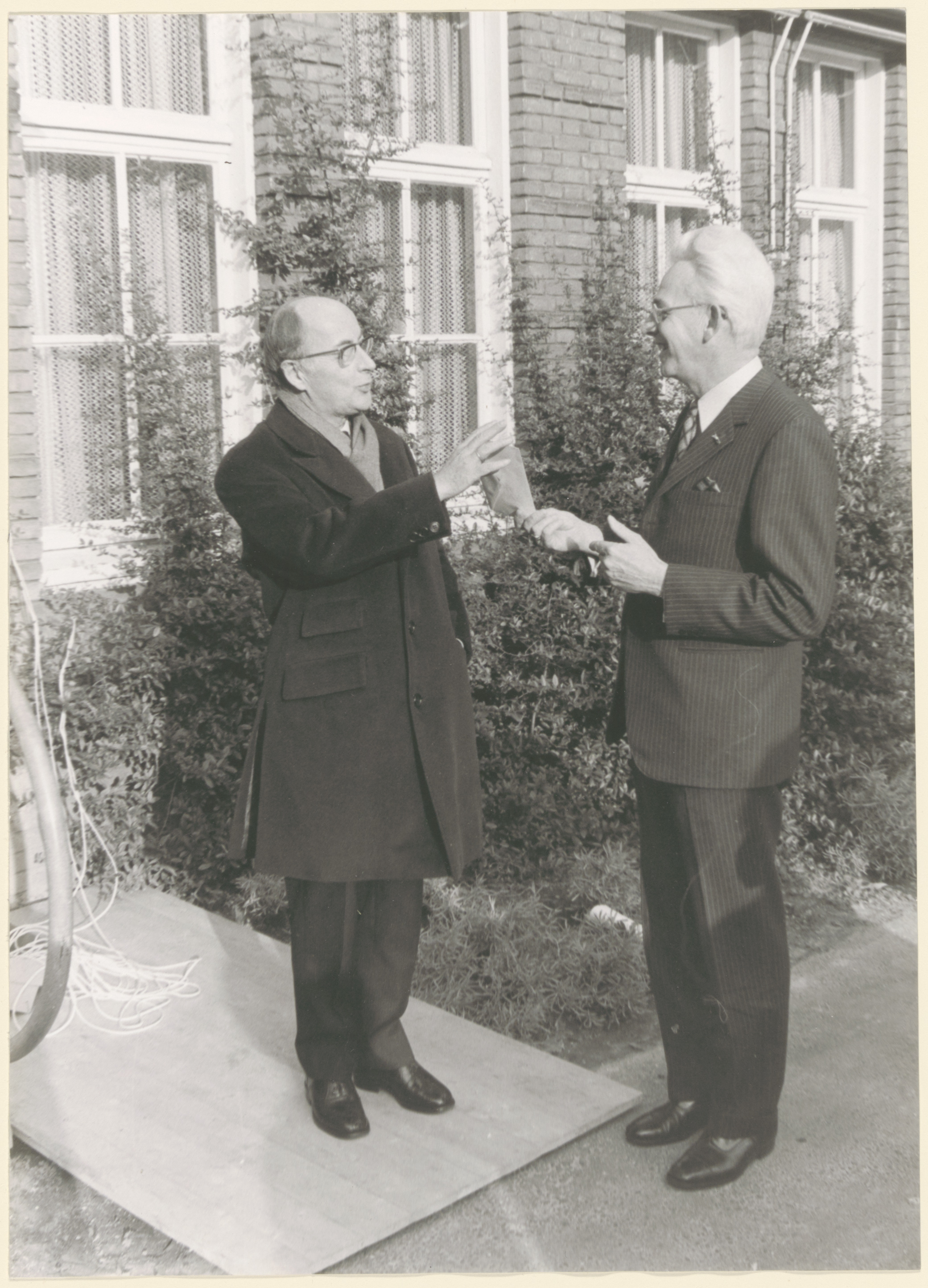 - Burgemeester mr. J.J. van der Lee (links) overhandigt D. Jongeneel, directeur van de Dienst Sociale Werkvoorziening Dordrecht, in diens functie van directeur van de stichting Zorg voor Gehandicapten een envelop (of omgekeerd), nadat de burgemeester de vlag heeft gehesen ter opening van het verbouwde bejaardentehuis huize Rozenhof aan de Van Strijsingel dat zal gaan dienen als gezinsvervangend tehuis voor ca. 50 geestelijk gehandicapten die in dienst zijn van de DSW.