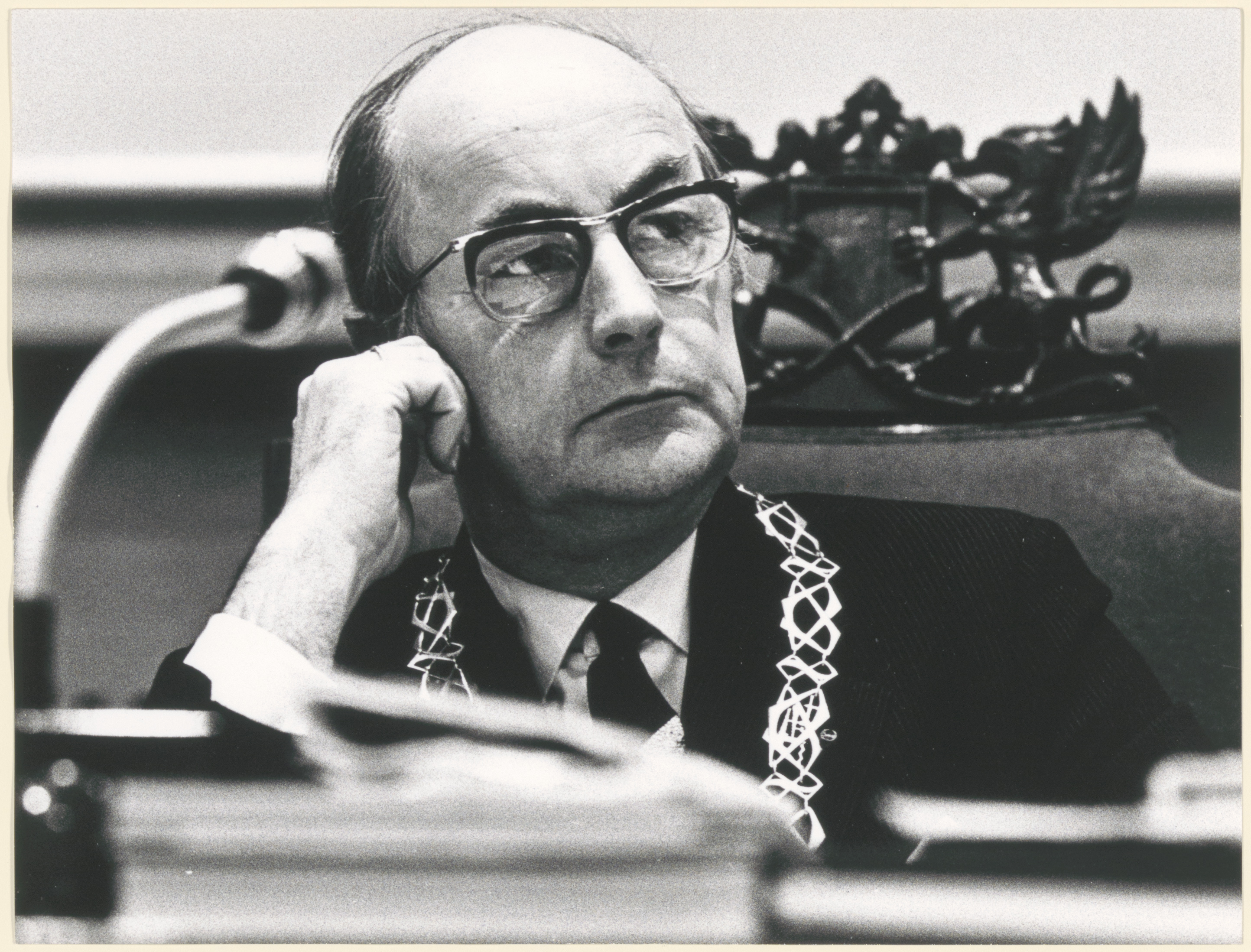 Portret van burgemeester mr. J.J. van der Lee, met ambtsketen gezeten in de voorzittersstoel, tijdens een raadsvergadering.